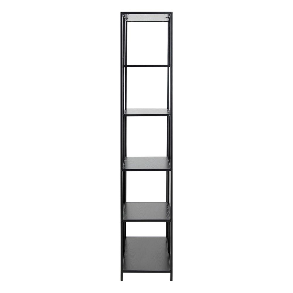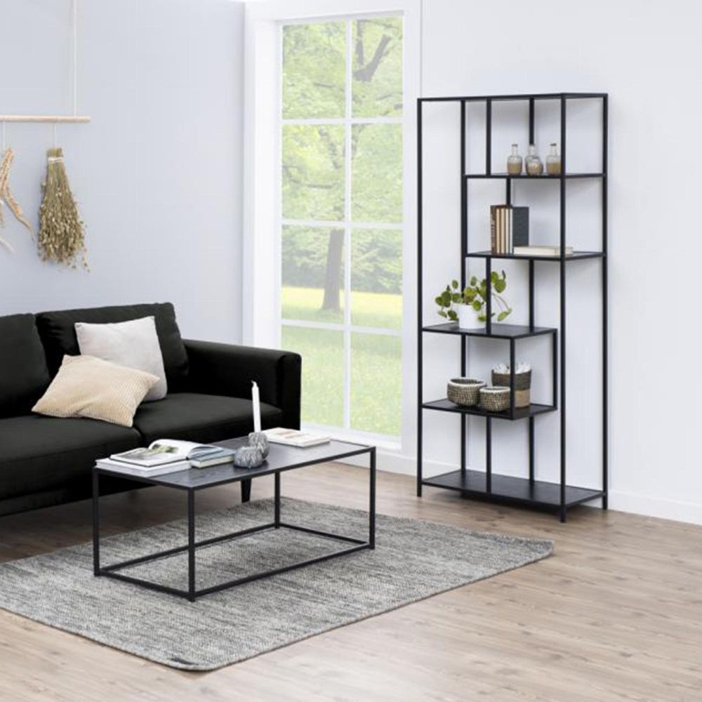 Item Code: 80892 Seaford bookcase, frame and base matt black rough powder coated steel, 5 shelves ash black rough melamine with asymmetrical detail. The bookcase of carefully selected materials is easy to maintain. With exclusive design rights this bookcase is the perfect accent to finish out a room with style. The piece has the personality to blend with many styles of decor featuring a striking wood effect and supported by a metal base with a powder coated appearance.Free Delivery