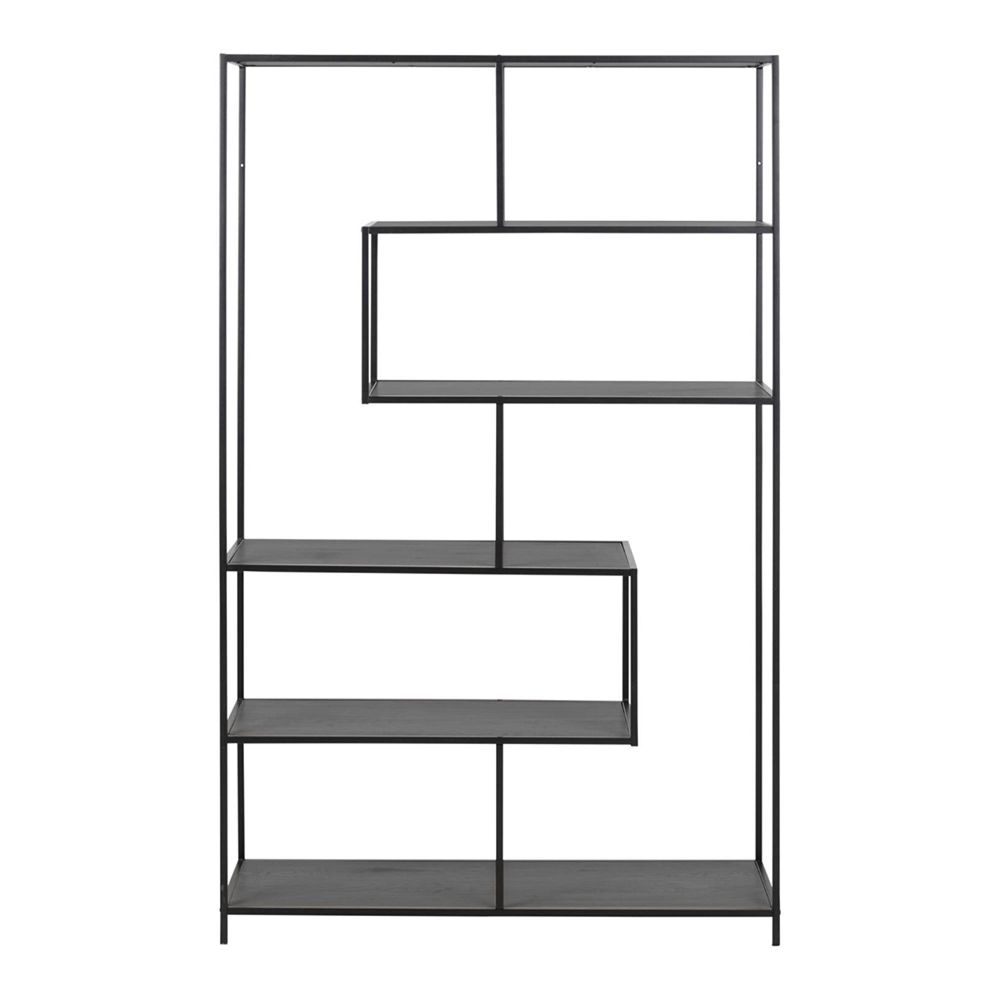 Item Code: 87944 Seaford bookcase, frame and base matt black rough powder coated steel, 5 shelves ash black rough melamine with asymmetrical detail. Designed with small details, this bookcase helps you make a big difference in your home. The 5 elegant shelves in black ash colour are set to a black rough powdered metal frame which creates a consistent monochromatic look. To highlight each decor object individually, the shelves are positioned asymmetrically, which increases the visual interest even more. It is a modern design element that adds depth to any interior naturally.Free Delivery