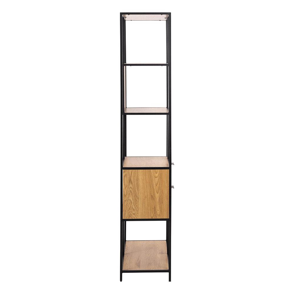 Item Code: 109279 Seaford bookcase, frame and base matt black rough powder coated steel, 2 drawers and 4 shelves matt wild oak rough melamine with reversible back panel and asymmetrical detail. Made with a frame from black steel, this bookcase is visually appealing thanks to the combination of colours, asymmetrical detail, and reversible back panel. Featuring 2 drawers and 4 shelves adorned in wild oak decor with easy care surface, it is the perfect spot to store books, games, and decor that deserves to be showcased. FSC certified.Free Delivery