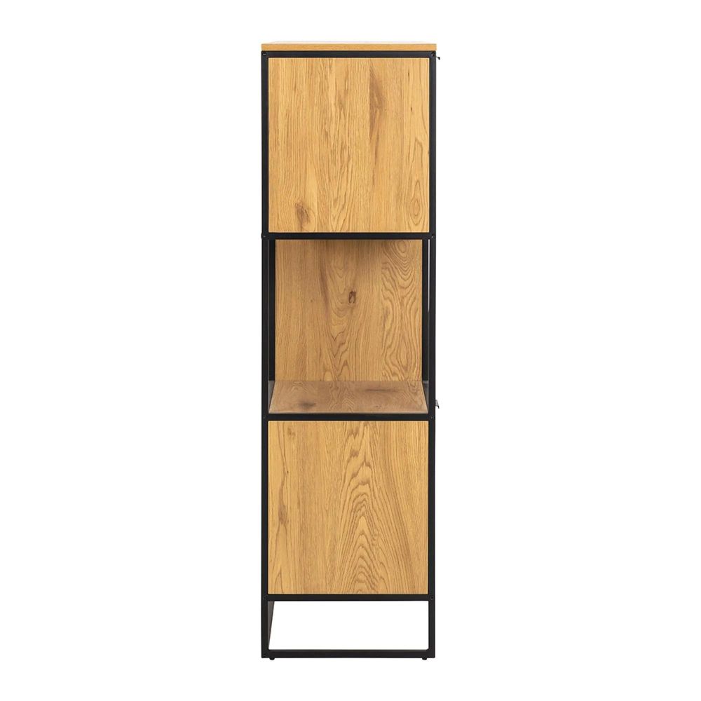 Item Code: H000023961 Swindon bookcase, frame and base matt black rough powder coated steel, 2 doors, 3 drawers and shelf matt wild oak rough paper with asymmetrical detail, metal runners and open compartment. Meet a bookcase that presents you with many possibilities. Designed with a shelf, 3 drawers, and 2 closed compartments, you can arrange your favourite decor as you would like. The bookcase is adorned with a wild oak look and complemented by a contrasting black steel frame, enhancing warmth and a contemporary feel in most homes.Free Delivery