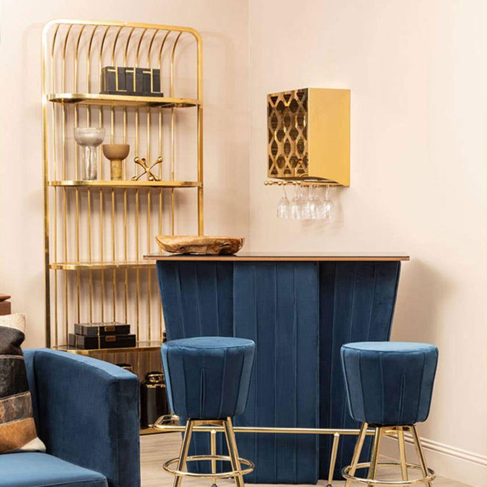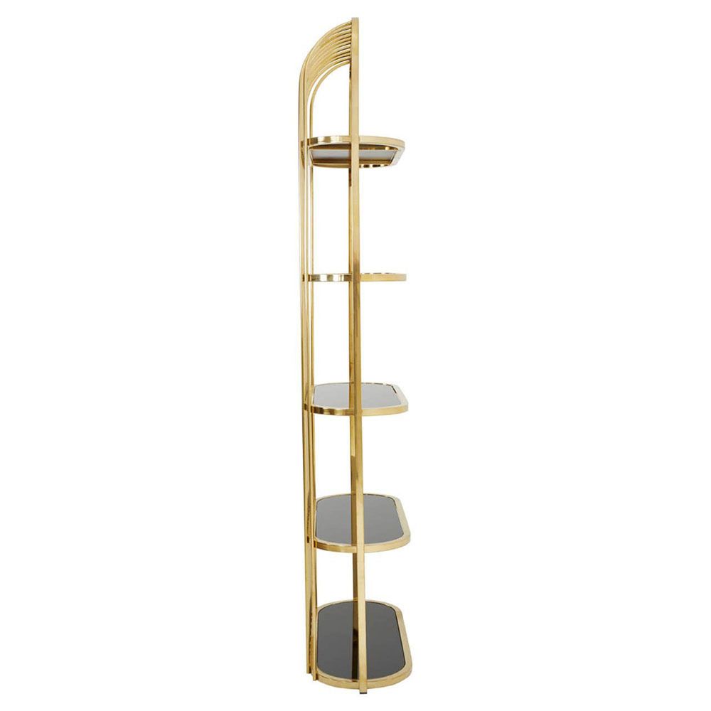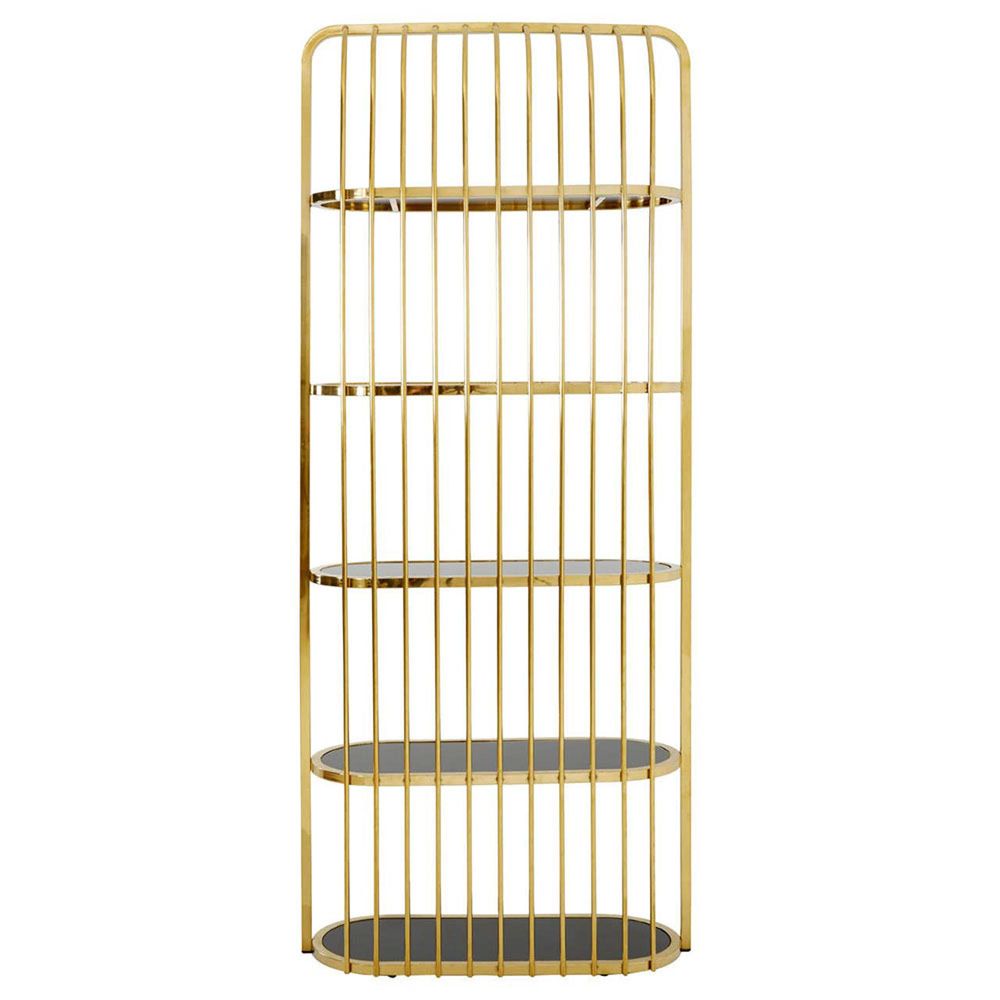 Item Code: 5502747 Add modern luxe design style to interiors with the sleek and reflective Horizon bookcase.This tall bookcase features slim stainless steel lines that curve at the top to form a hood over the five shelves. Each shelf is made from tempered glass and is coloured black to contrast the gold finish frame.