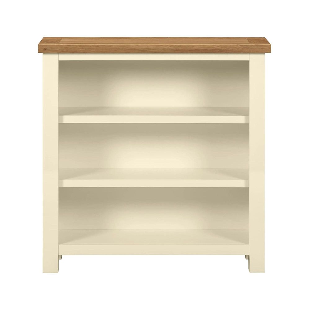 Blending modern simplicity with country appeal, this small wide bookcase features a painted finish and oak top. Compact yet spacious, it provides plenty of room for books or display items, perfect for smaller living areas or home offices.
