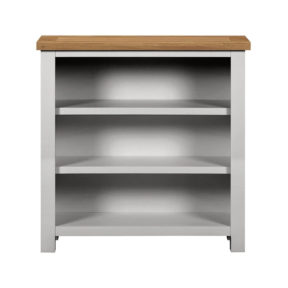 Blending modern simplicity with country appeal, this small wide bookcase features a painted finish and oak top. Compact yet spacious, it provides plenty of room for books or display items, perfect for smaller living areas or home offices.