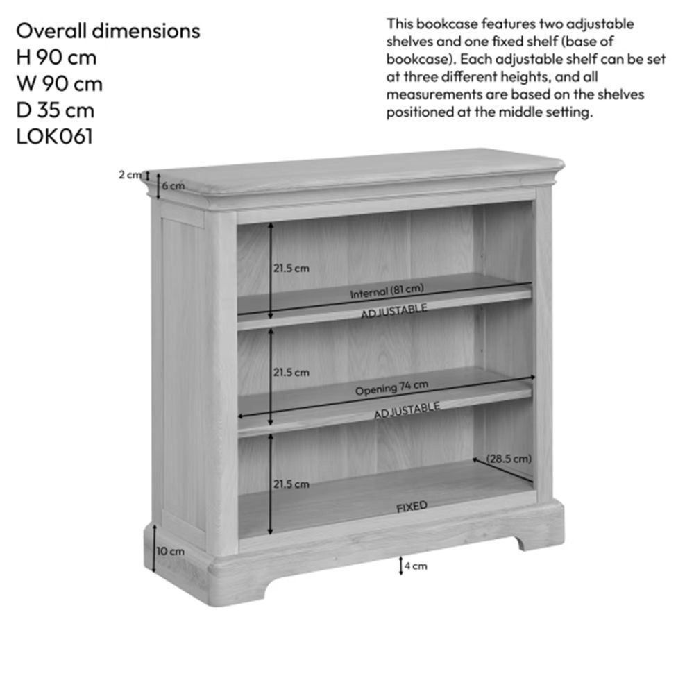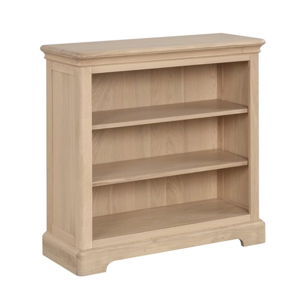 Item Code: LOK061 Add a cosy touch of character to any room with this compact low oak bookcase. Soft curves, a durable lacquer finish, and a solid oak top give it a modern-country feel. Adjustable shelves make it easy to display your favourite books, decor, or family photos ideal for smaller spaces or reading corners.