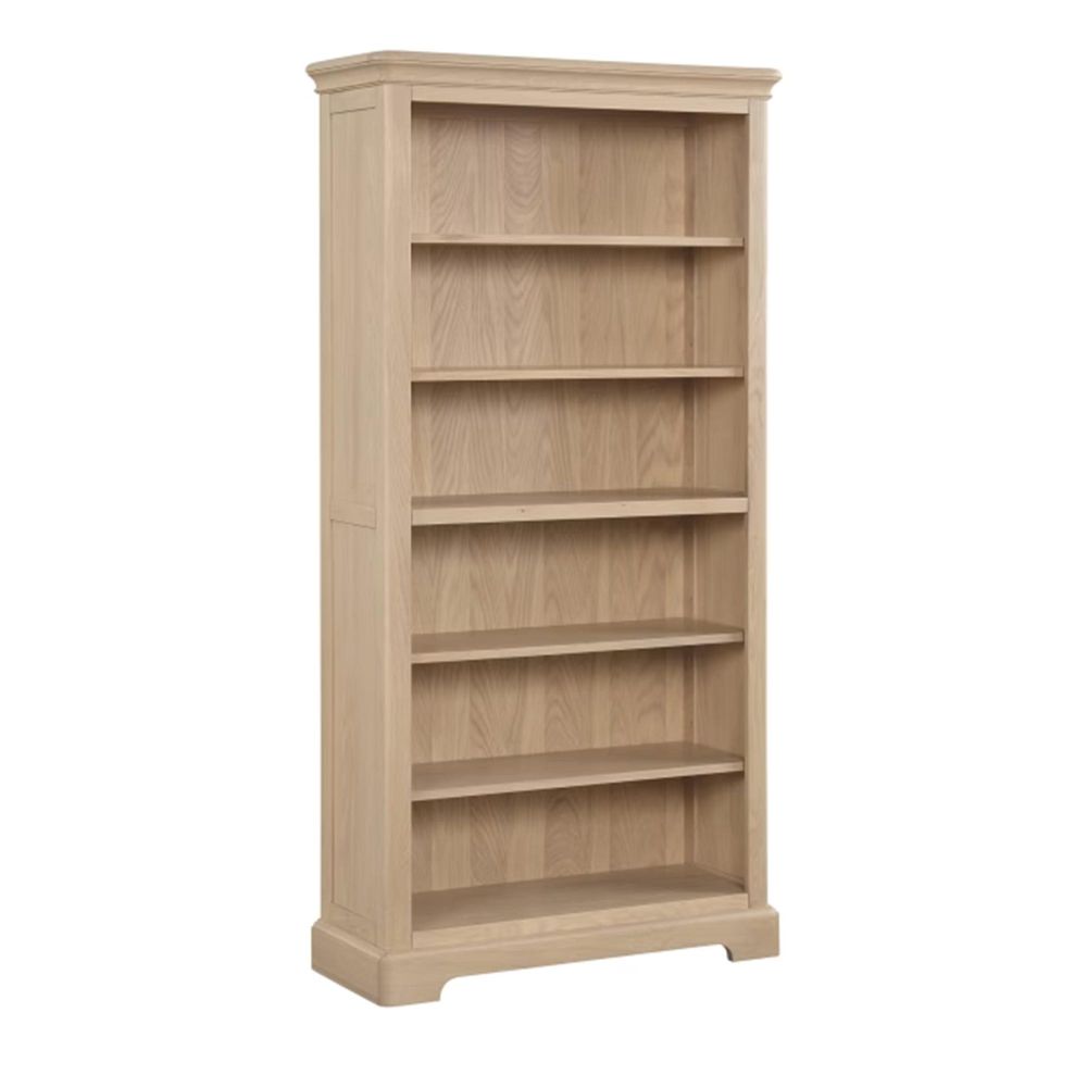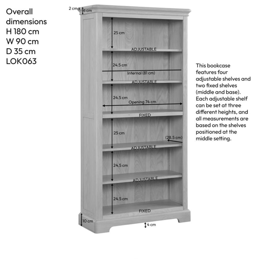 Item Code: LOK063 Showcase your style with this tall oak bookcase. Designed with classic curves, a warm oak top, and a beautifully smooth finish, it suits both contemporary and traditional interiors. With generous shelf space, over 4 adjustable shelves and 2 fixed, it's perfect for everything from novels to decorative pieces making elegant organisation effortless.