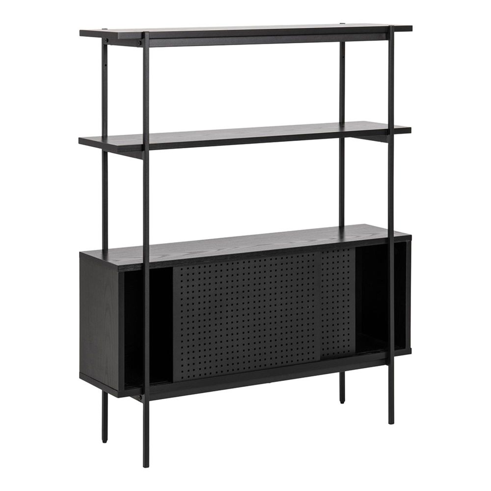 Item Code: 90918 This elegantly designed bookcase is perfect for any home decor. It features two sliding doors and two shelves to offer ample storage space. The finish is a sleek black to match any style. Constructed from melamine and metal, it is built to last. Put your favorite books and items in this beautiful piece and enjoy its timeless look.