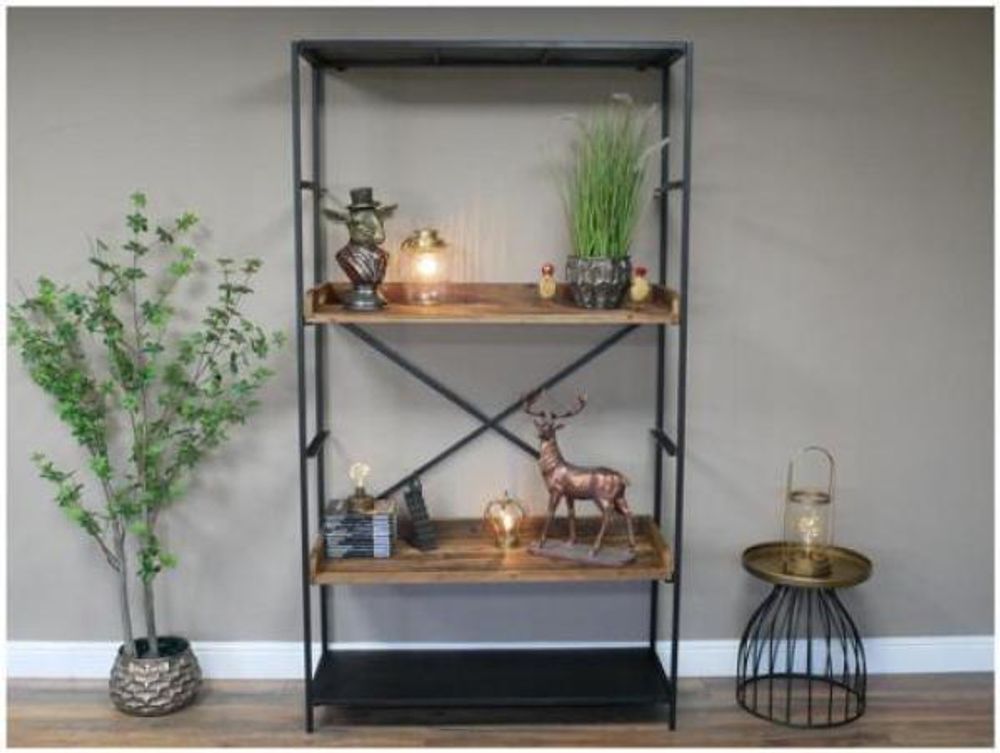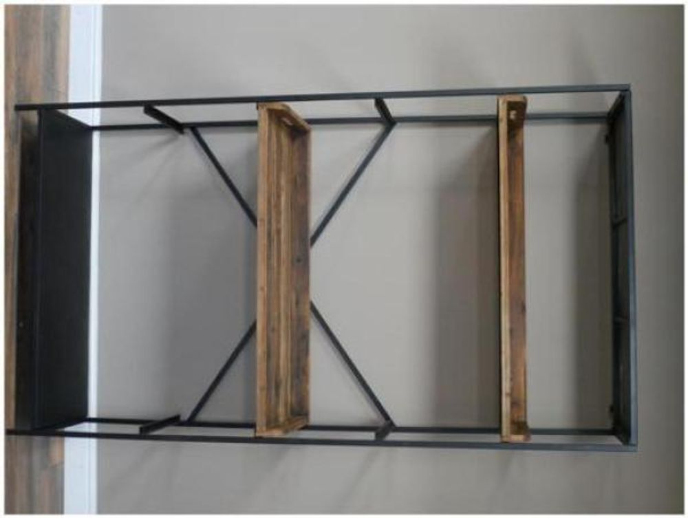 Made from iron and reclaimed wood. Two shelves total can be moved into various positions.
