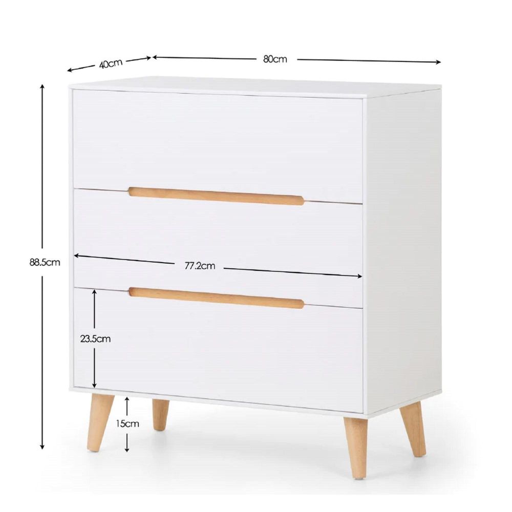 Item Code: ALI202 A stylish, retro-inspired chest with three large drawers in an immaculate matt white lacquered finish, with complementary tapered oak finish legs and recessed handles to provide easy opening. The sleek Scandinavian feel fits beautifully with any dcor.