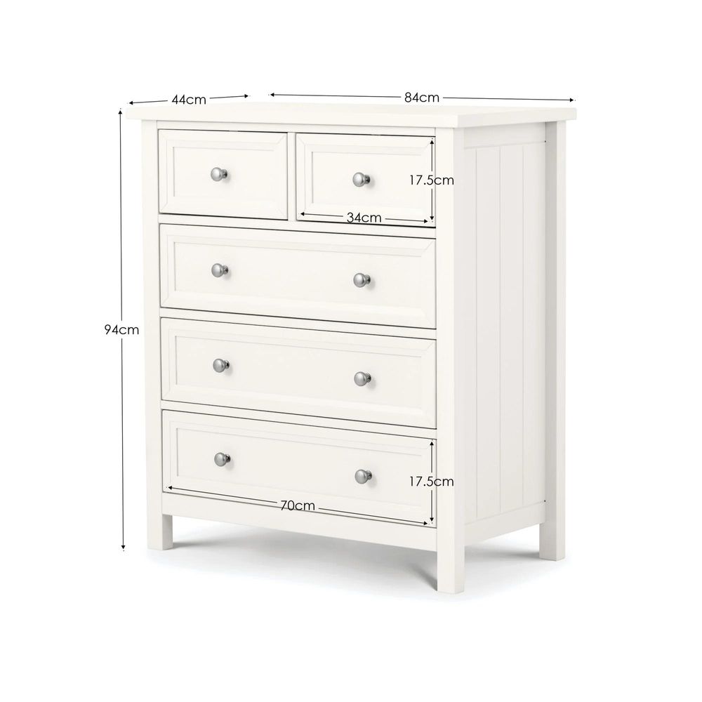 Item Code: MAI103 Maine is an elegant New England style range of bedroom furniture. The combination of exquisite surf white lacquered finish with characteristic side panelling and detailed chamfered cabinetry makes for a soothing and refined aesthetic with timeless appeal, while delicate pewter handles add the perfect finishing touch. The Maine 3+2 drawer chest offers great storage with three large drawers topped with two smaller drawers.