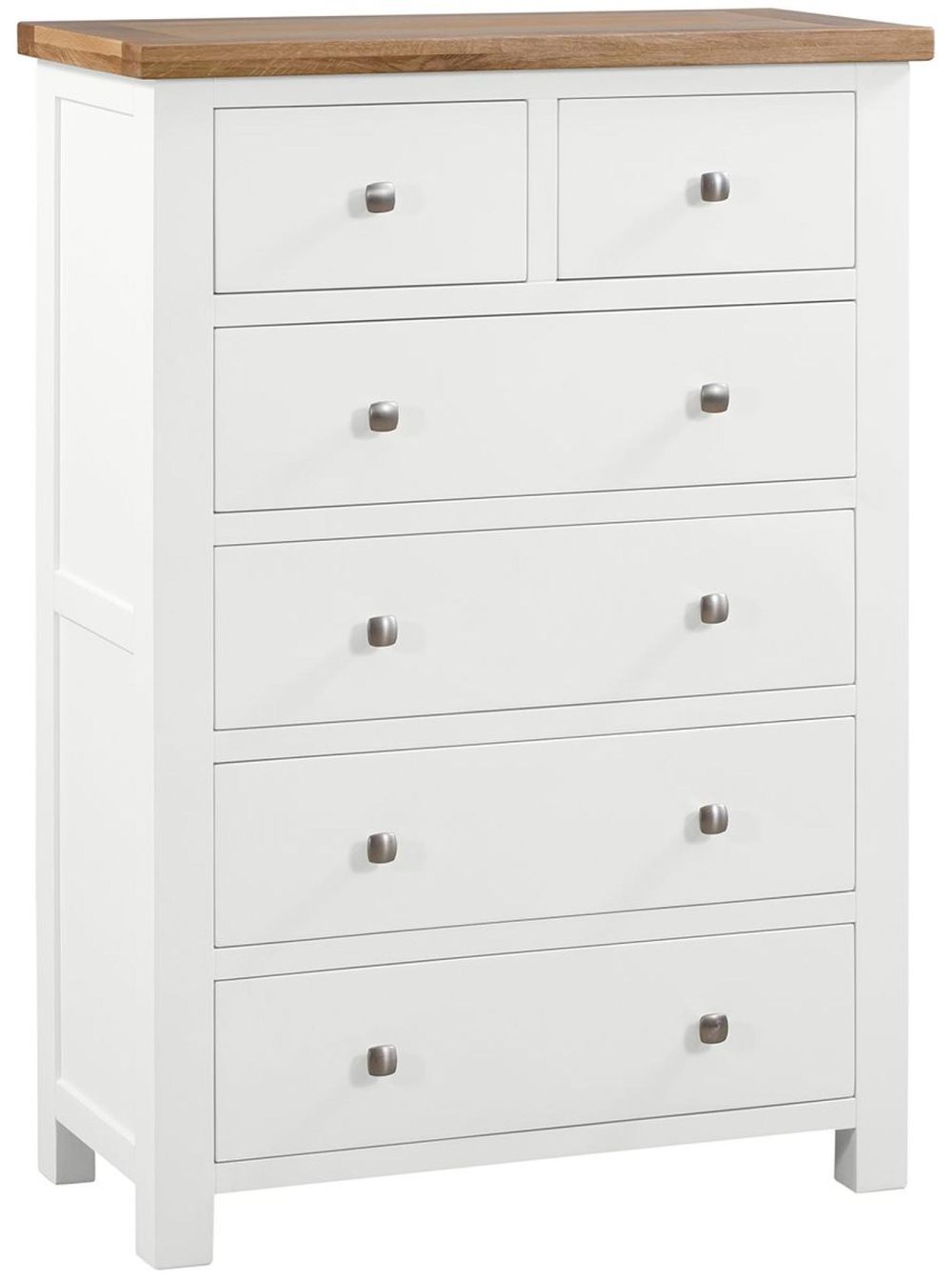 This chest features two smaller top drawers, ideal for everyday essentials, along with four spacious lower drawers to neatly store clothing and accessories. Built from solid oak, MDF, and rubberwood, it offers durability and strength, while dovetailed drawer construction ensures long-lasting quality. The detailed panelling and square metal knobs add a contemporary finish, making it versatile enough to suit both classic and modern interiors.