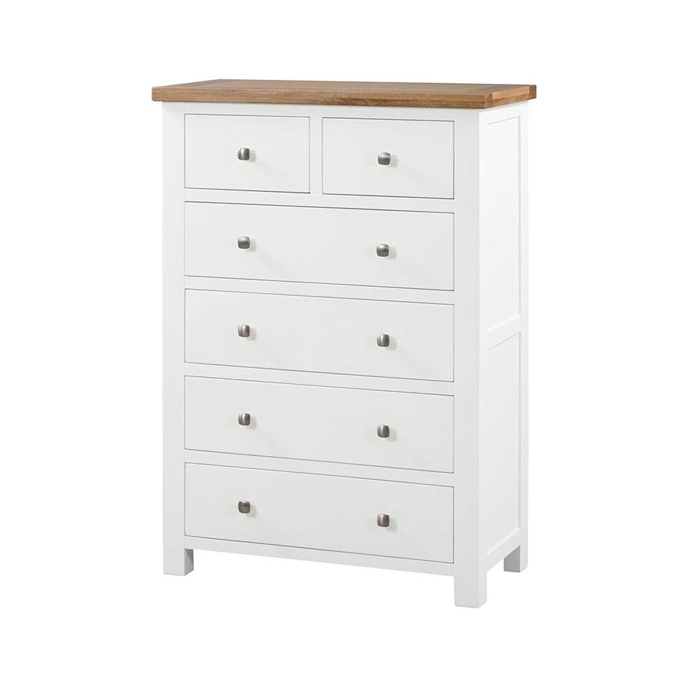 The Lundy White Painted 2+4 Drawer Chest combines generous storage with elegant design, making it a practical and stylish addition to any bedroom. Finished in a crisp white paint and topped with a light oak lacquered surface, it blends timeless character with modern appeal.