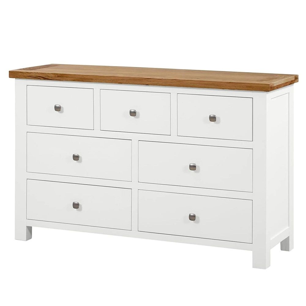 The Lundy White Painted 3+4 Drawer Chest is designed to bring both elegance and practicality to your home. With its crisp white painted finish and contrasting light oak lacquered top, this chest combines timeless character with modern functionality, making it a perfect storage solution for any bedroom.