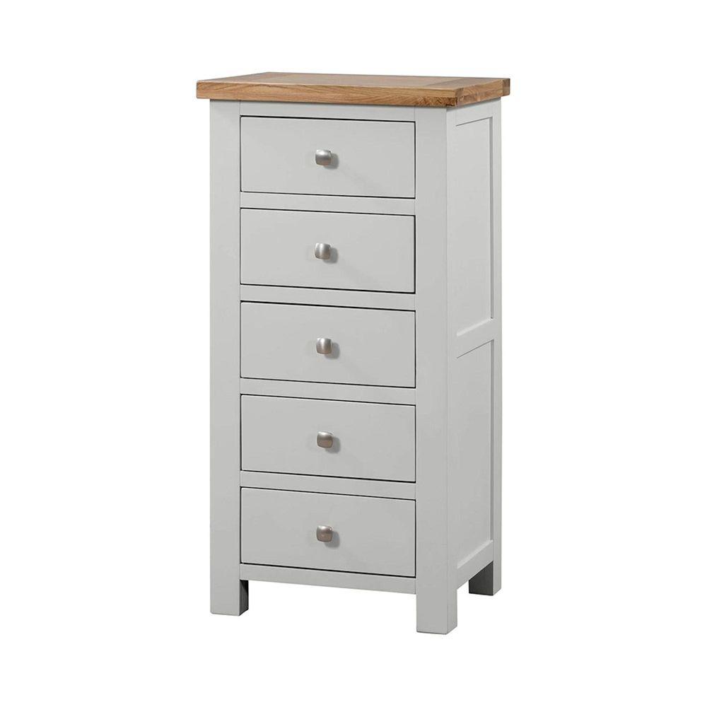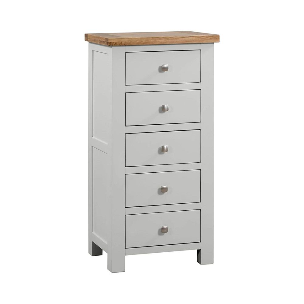 Bring timeless design and practical storage into your home with the Lundy Grey Painted 5 Drawer Narrow Chest. Crafted with care, this piece combines a beautifully painted grey body with a contrasting light oak top, giving it a classic yet contemporary look. Its slim, vertical shape makes it a smart choice for bedrooms, hallways, or compact living areas where space is precious but style is non-negotiable.
