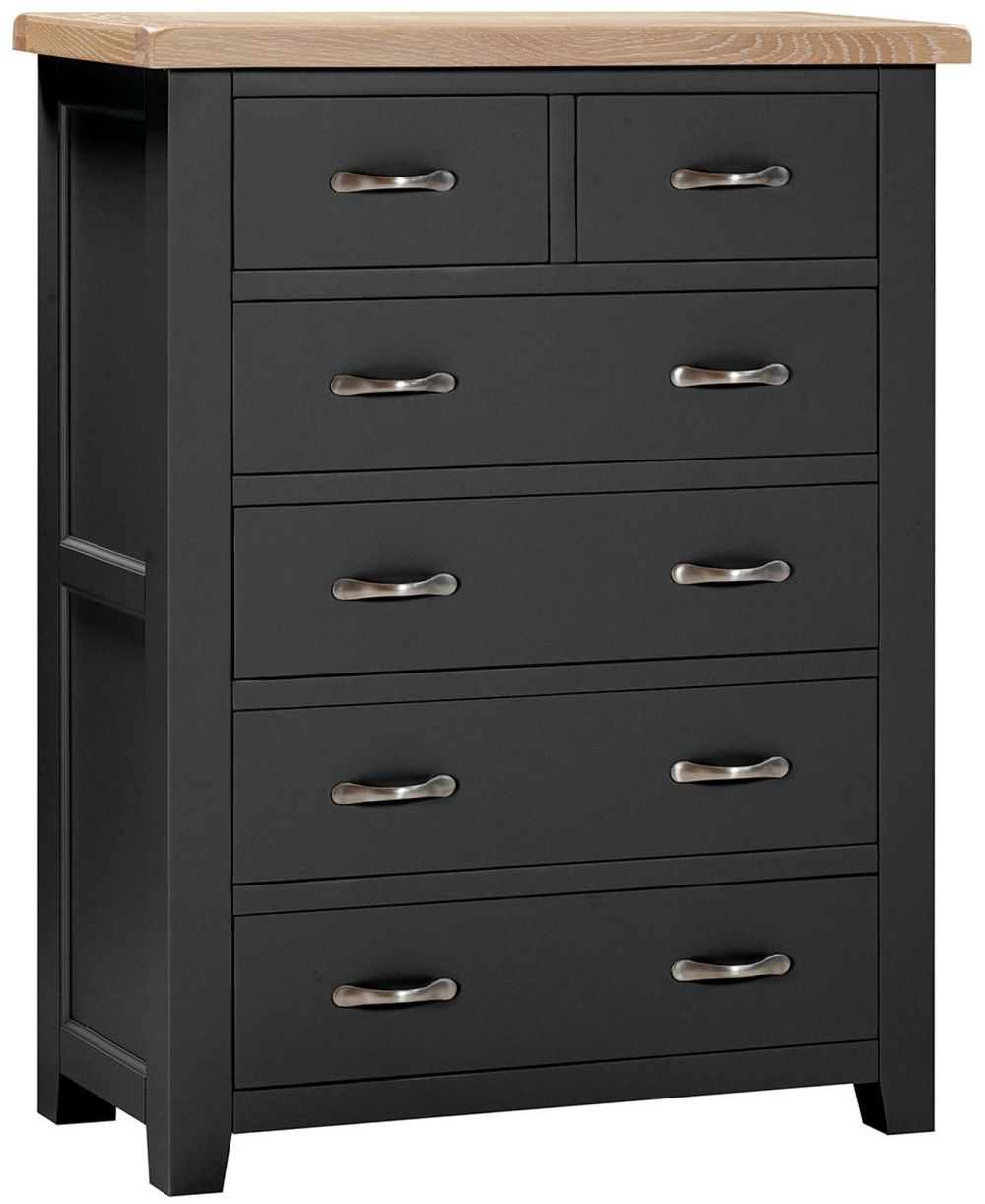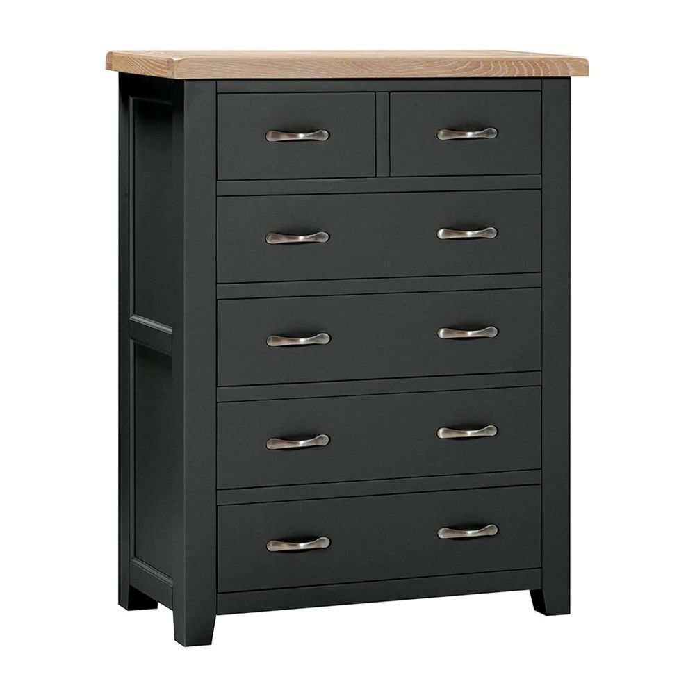 The Wilmont Black Painted 2+4 Drawer Chest is designed with both practicality and refined style in mind. Offering a generous combination of two smaller top drawers and four full-sized drawers beneath, this chest is perfect for organising clothing, accessories, and everyday essentials. Its bold black finish paired with a pale oak top creates a striking contrast, while softened corners and block legs give it a modern edge that complements both classic and contemporary interiors.