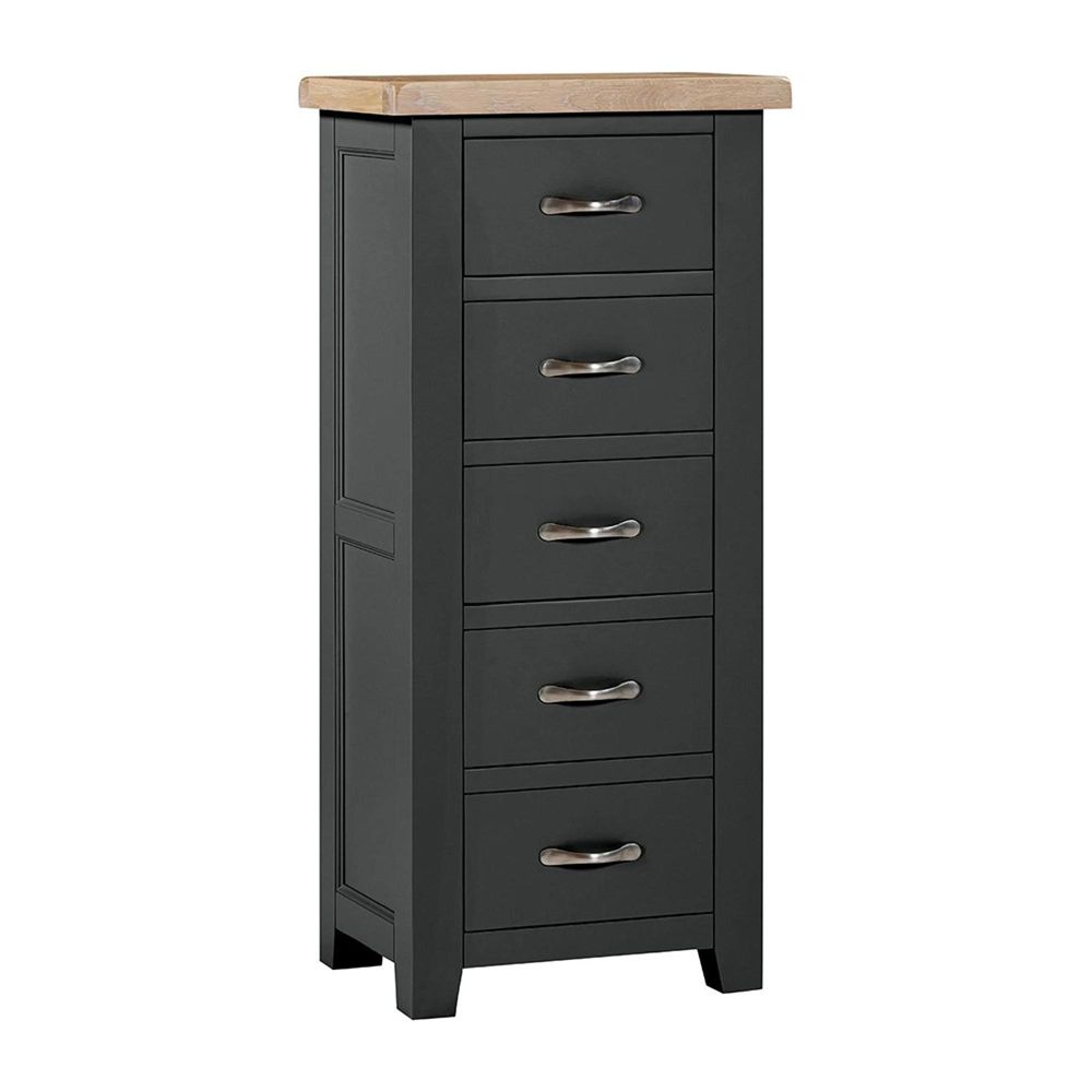 The Wilmont Black Painted 5 Drawer Narrow Chest brings timeless craftsmanship together with a bold, modern edge. Designed for bedrooms where style and practicality are equally important, this tall chest offers a slim silhouette that fits beautifully into smaller spaces without compromising on storage. Its matte black painted finish, softened corners, and pale oak top create a striking contrast that makes this piece a true statement in any setting.