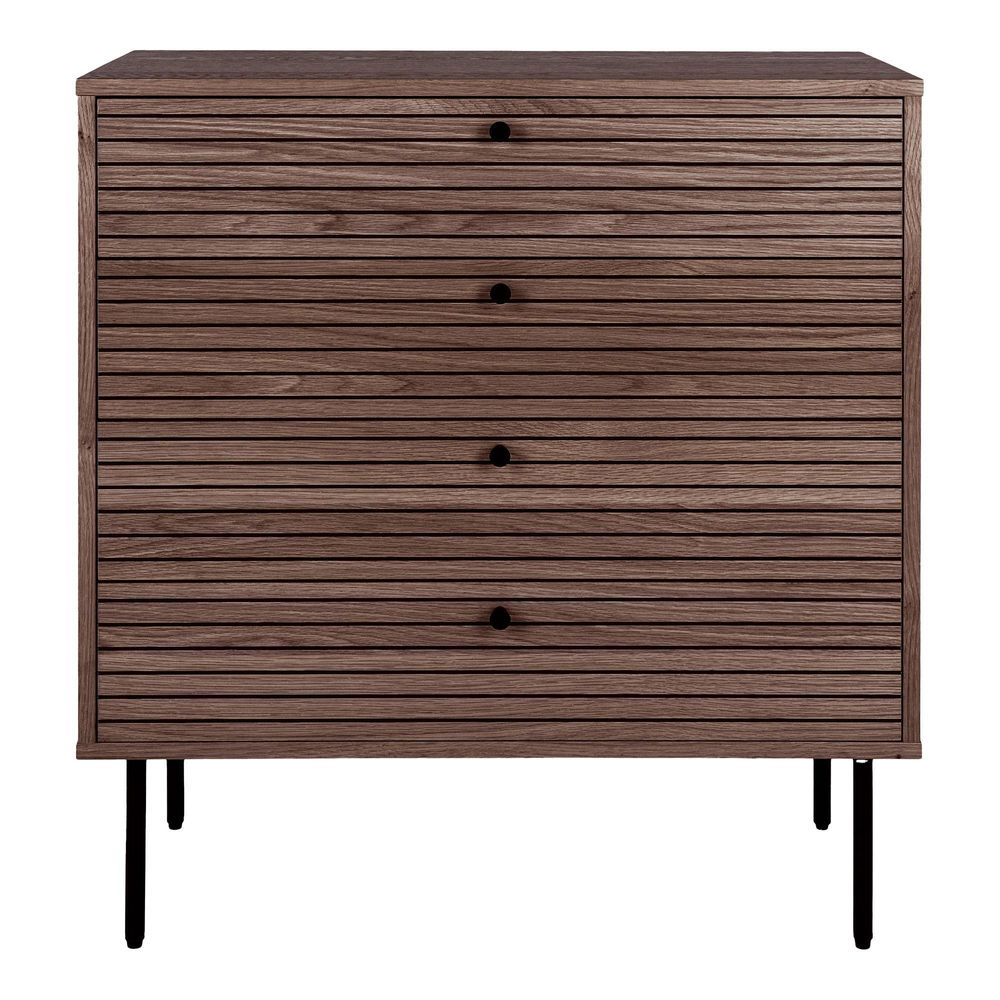 Constructed from premium oak veneer, the chest showcases a distinct, ridged design that adds depth while maintaining a clean, understated profile. The solid black metal legs offer a subtle industrial contrast, giving the piece a modern-rustic presence without compromising balance or elegance.