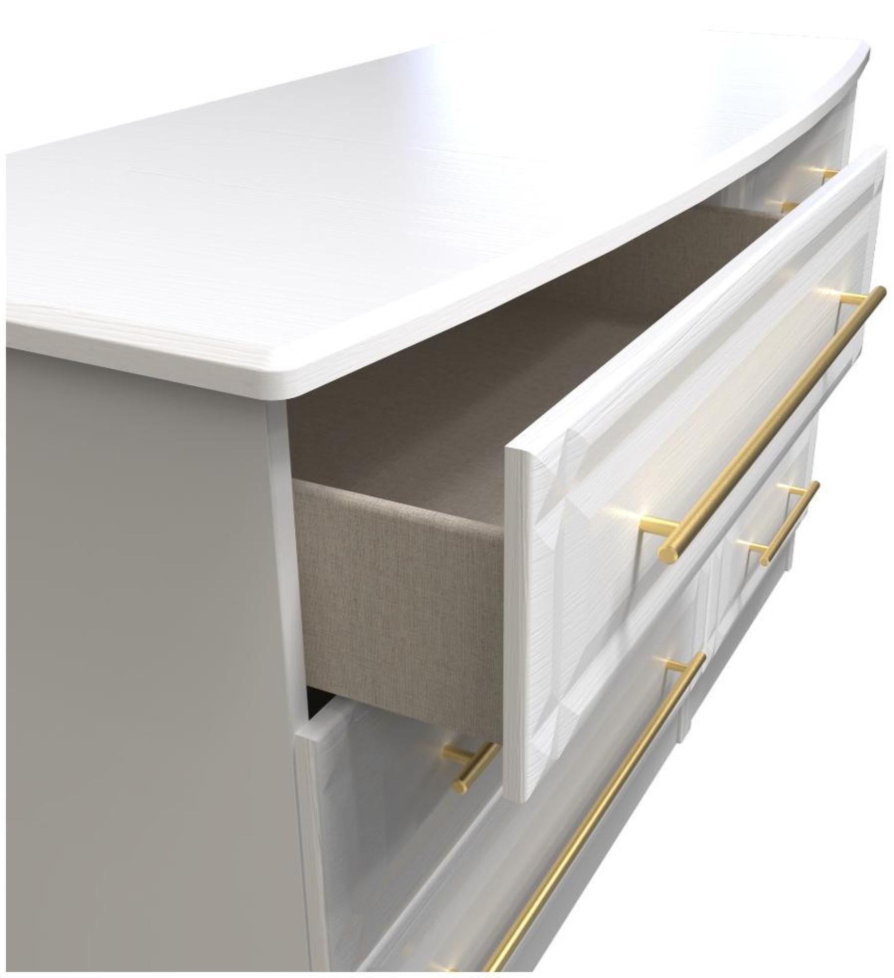 Chamfered edges combined with contemporary and modern styling create the Faye range. This stylish range is available in a selection of durable scratch resistant wood effect or matt finishes. With gold T-Bar handles on all doors and drawers.