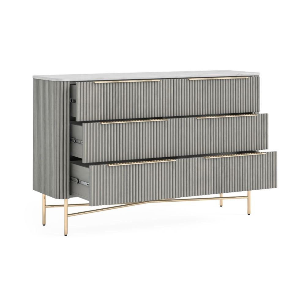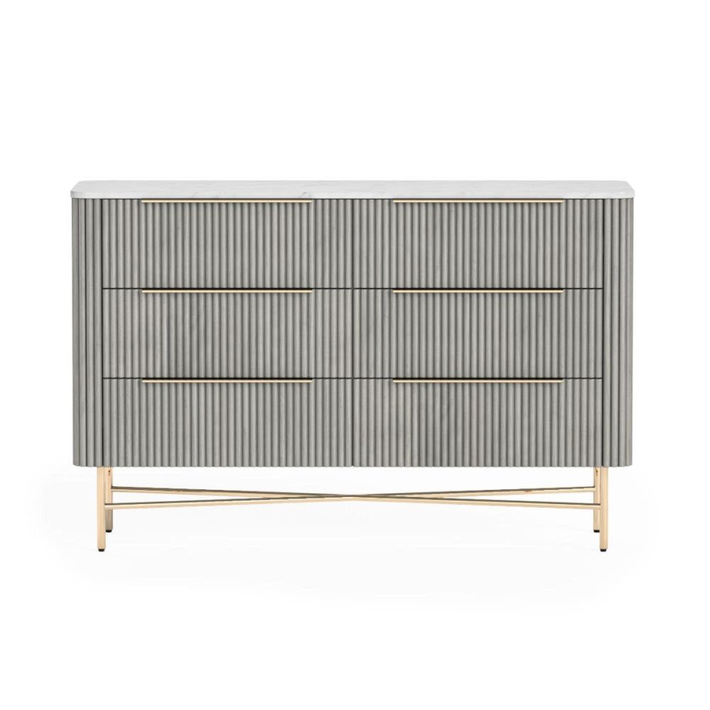 Isabella Grey Chest - 6 Drawer Wide Fluted - White Marble Top