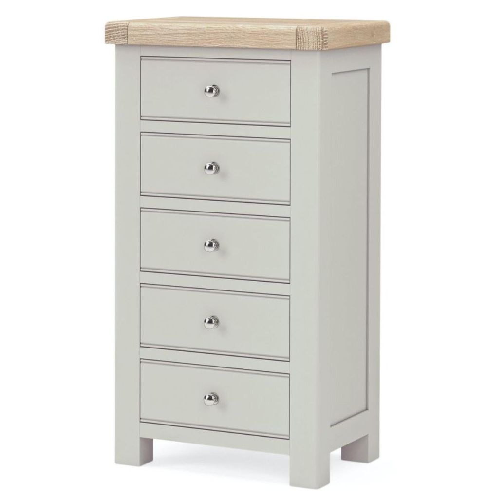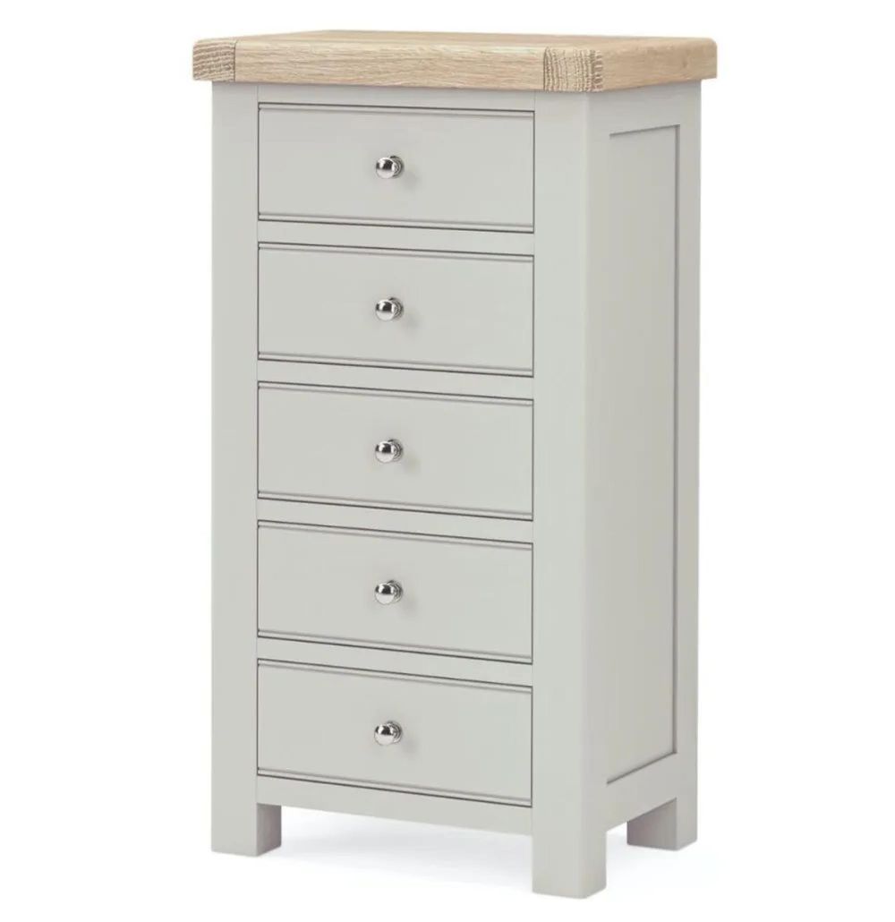 Crafted with attention to detail and built to last, the Salcombe Grey Oak 5 Drawer Tallboy Chest combines classic style with everyday functionality. Designed from a blend of solid oak, oak veneer, and mixed woods, this tallboy showcases the craftsmanship and quality you would expect from premium furniture. Its natural oak-finished top provides a rustic touch, while the painted finishes in sage green or stone grey complement a wide range of interiors, from traditional to contemporary.