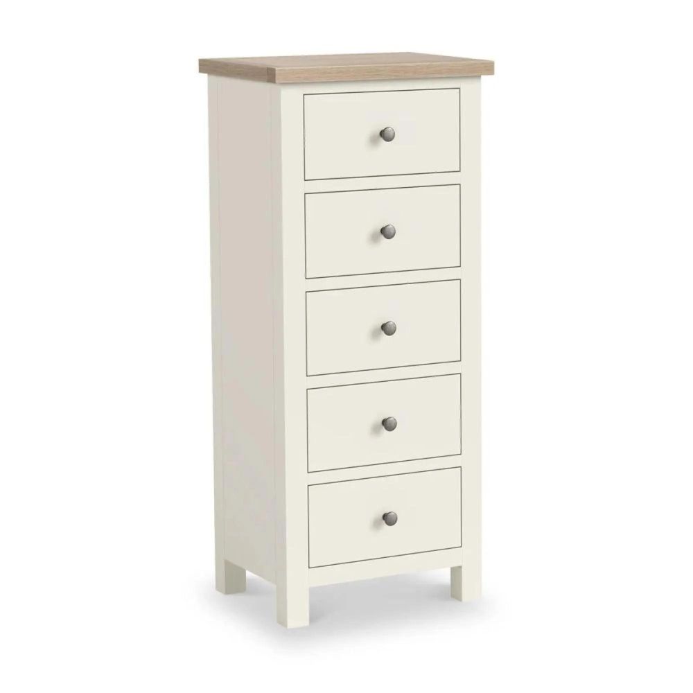 The Modern White Painted 5 Drawer Tall Chest is designed for homes that need practical storage without compromising on style. Slim and space-saving, it offers a vertical storage solution that fits neatly into bedrooms, dressing areas, or hallways while bringing timeless elegance to your interior.