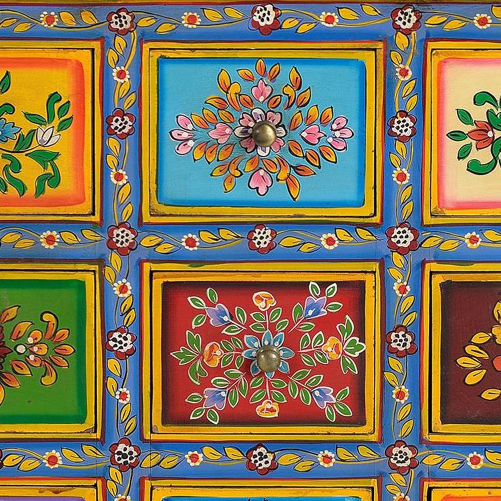 CHEST OF 9 DRAWERS IN MANGO WOOD, WITH HAND PAINTED DETAILS.- DRAWER FRONT MEASUREMENT: 12