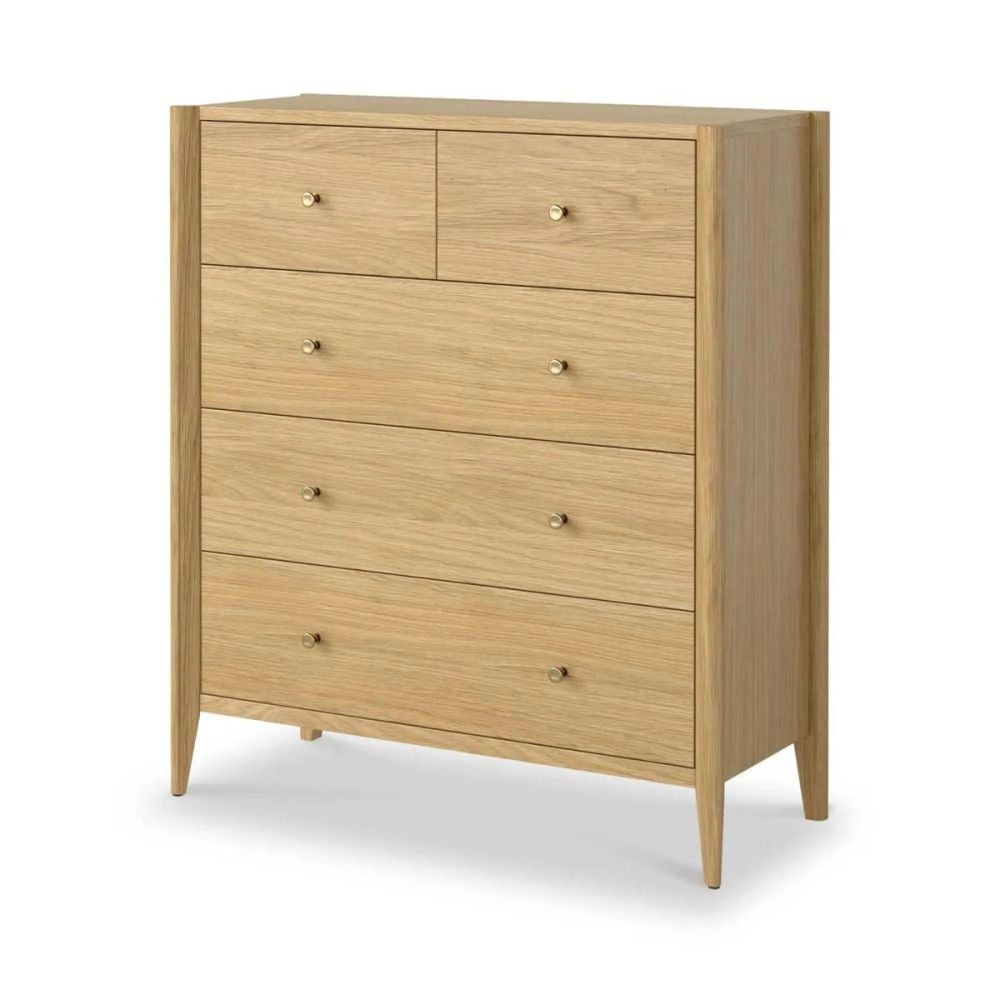 Available in a choice of natural oak for a light, contemporary feel or rich brown oak for a deeper, classic look, this chest complements both modern and traditional interiors. Each drawer glides smoothly and is finished with understated brass handles, adding a refined detail that enhances the natural beauty of the oak. Distinctive tapered legs lend a subtle Mid-Century influence, while the clean, panelled design ensures this piece blends seamlessly with a range of décors.