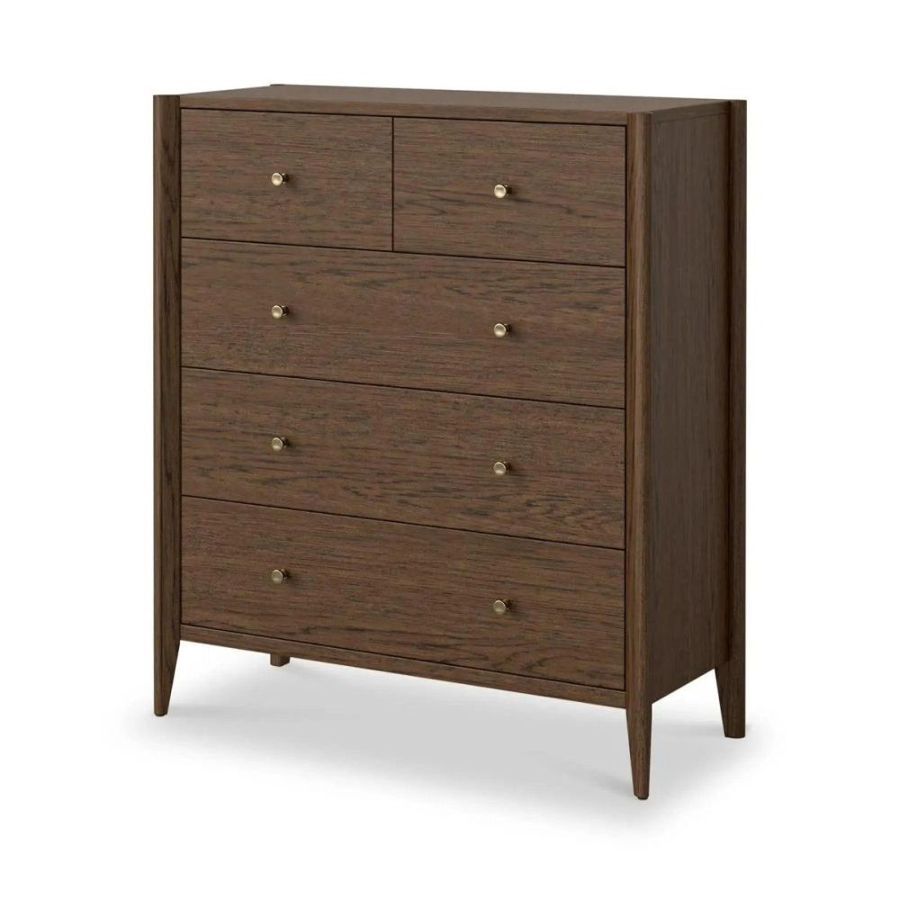 Featuring a combination of 2 smaller drawers and 3 larger drawers, it provides versatile storage for clothing, accessories, or other essentials. The smooth-gliding drawers with subtle brass handles, along with the tapered legs, give this piece a refined Mid-Century appeal, while the clean, minimalist lines ensure it complements modern and traditional interiors alike. Available in natural oak or rich dark oak, it can easily coordinate with existing bedroom furniture.