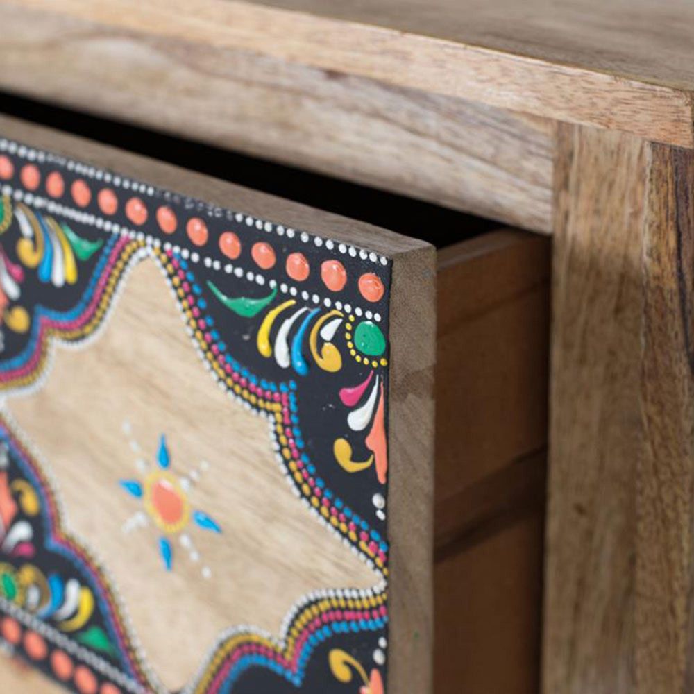 Item Code: 1763 Solid mango wood chest of drawers, with a robust and natural design. The fronts of the drawers are decorated with hand-painted details, providing an artistic and unique touch.