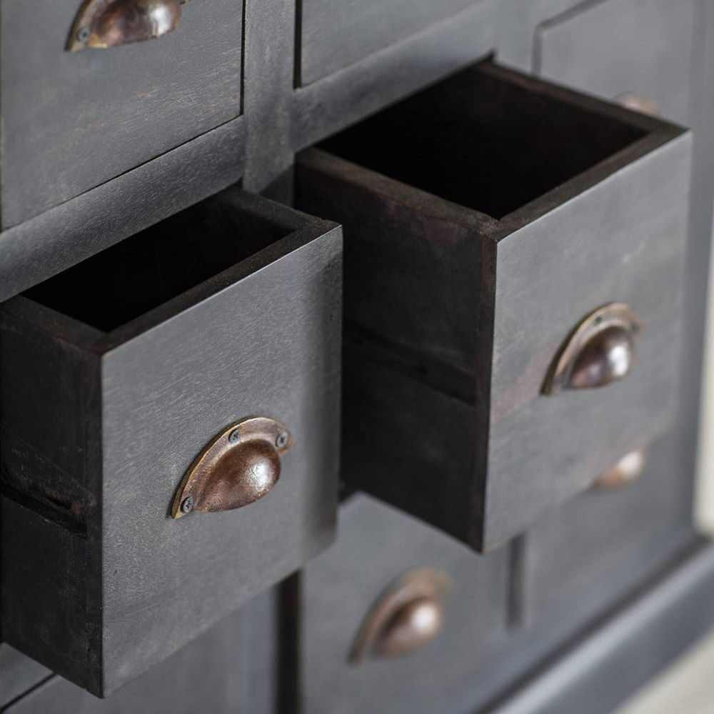 Item Code: 705412 Looking to expand your home storage solutions The Hoxton chest of drawers in Antique Black Mango cuts a distinctive silhouette, made with durable and sustainable mango wood which has been painted in a rich black for that never goes out of style aesthetic. It offers 15 smaller drawers (W14 x D28.5 x H19cm) and a single large tray drawer at the top (W71.5 x D30 x H3cm). We chose Mango wood for this chest due to its incredible eco credentials it's fast growing, a durable hard wood, and because Mango wood is a by product, harvested after the tree has finished fruiting.Free Delivery