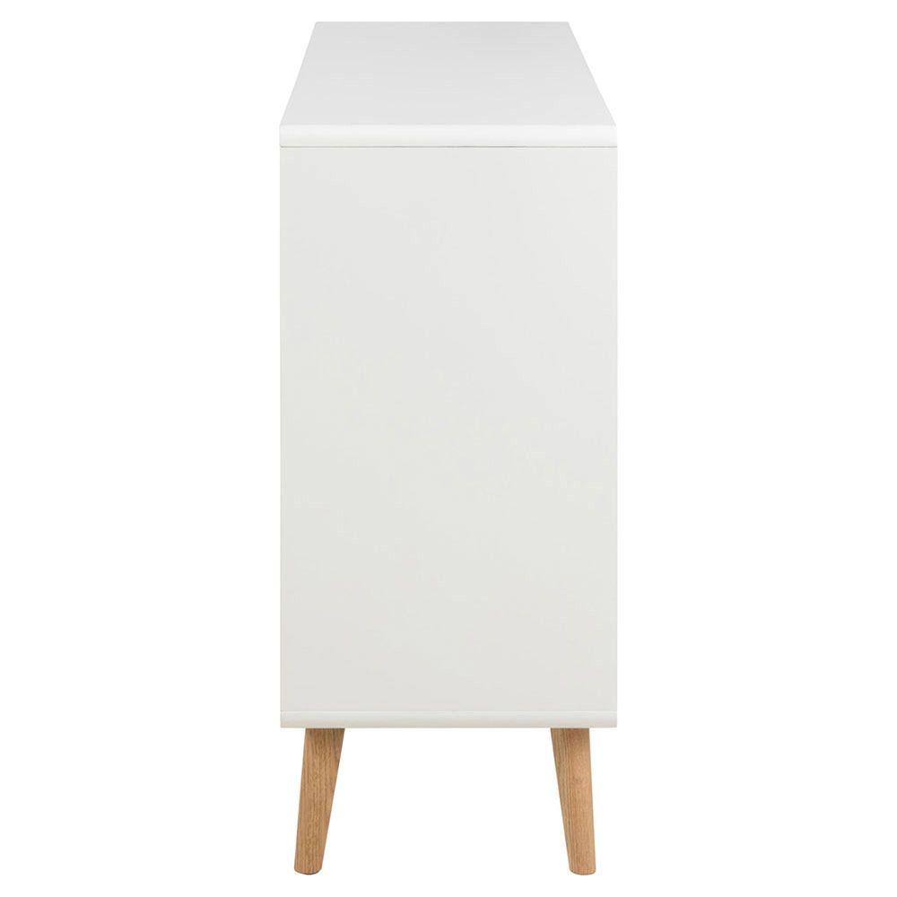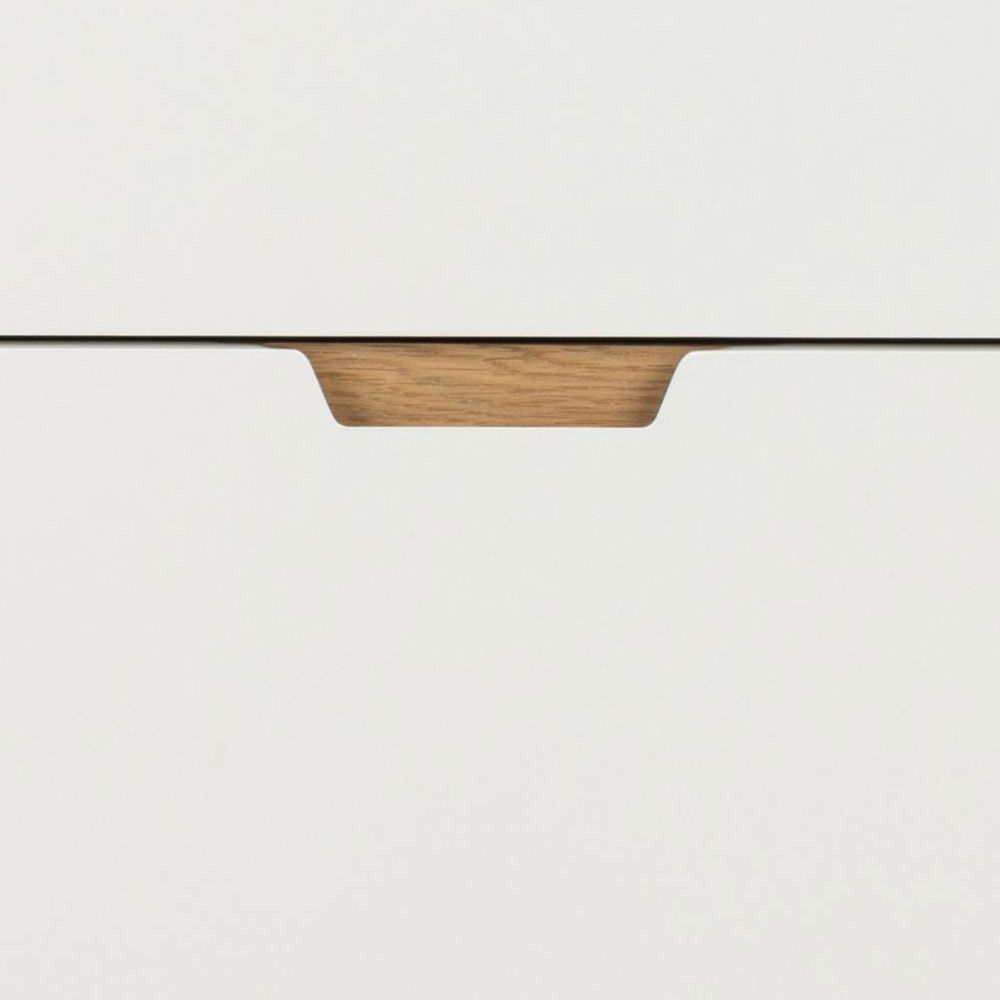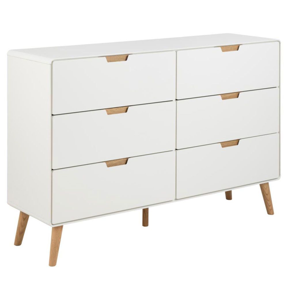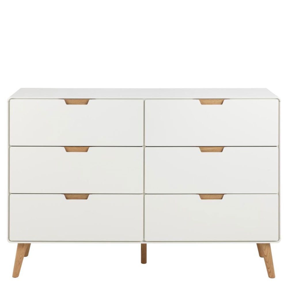Lowell chest of drawers, top, frame and 6 drawers white UV painted MDF, base NC lacquered oak with soft close, 135x40x90 cmThis spacious 6-drawer chest of drawers provides ample storage for your clothes, toys, and books. The white-painted drawers will match almost every room with their minimalistic appeal. The oak details complement well the overall aesthetics. It is a storage solution that effortlessly blends functionality and design.