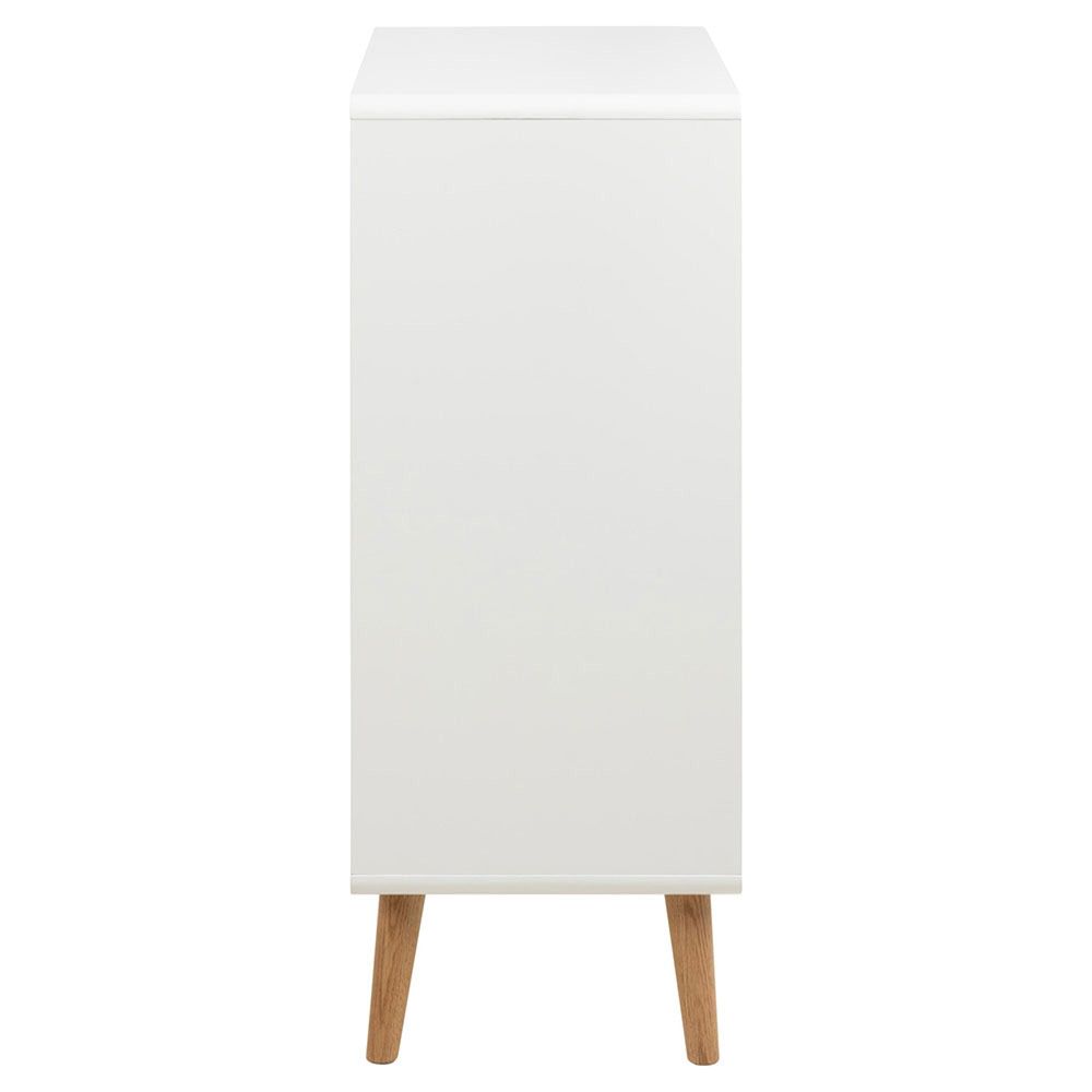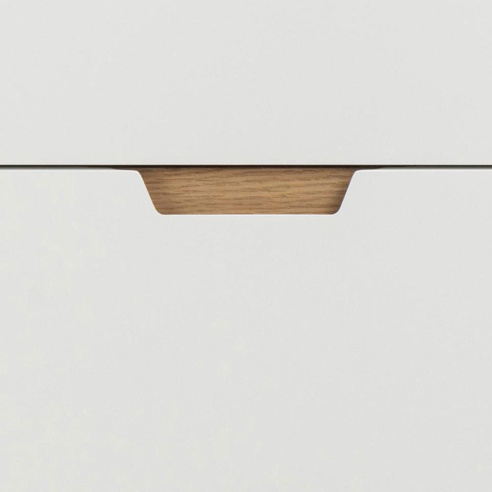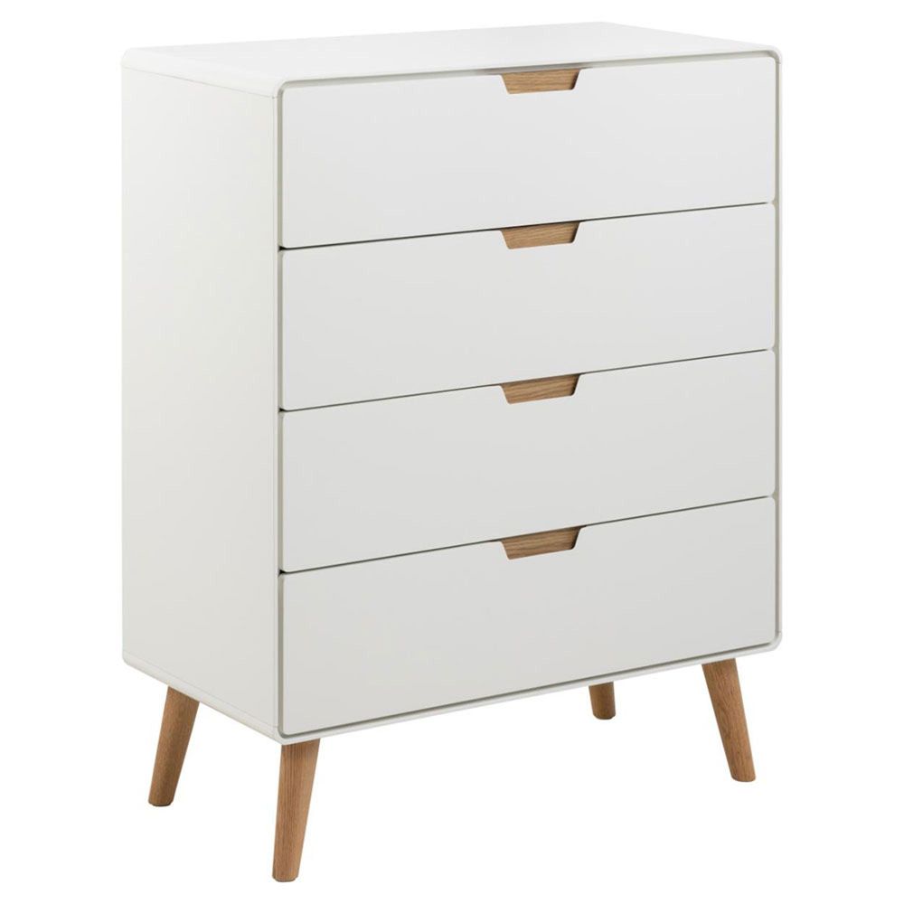 Lowell chest of drawers, top, frame and 4 drawers white UV painted MDF, base NC lacquered oak with soft close, 80x40x100 cmThis spacious 4-drawer chest of drawers provides ample storage for your clothes, toys, and books. The white-painted drawers will match almost every room with their minimalistic appeal. The oak details complement well the overall aesthetics. It is a storage solution that effortlessly blends functionality and design.