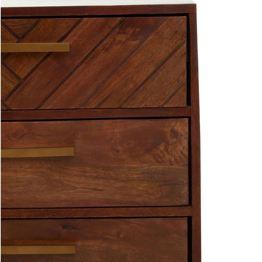 Item Code: 5529171 The Gaya five drawer chest has an elevated bohemian aesthetic created by the intersecting panelled mango wood and gold iron details.The Gaya chest has an elevated bohemian aesthetic created by the intersecting panelled mango wood and gold iron details. In addition to style, the chest offers an abundance of storage opportunities from the five spacious drawers.
