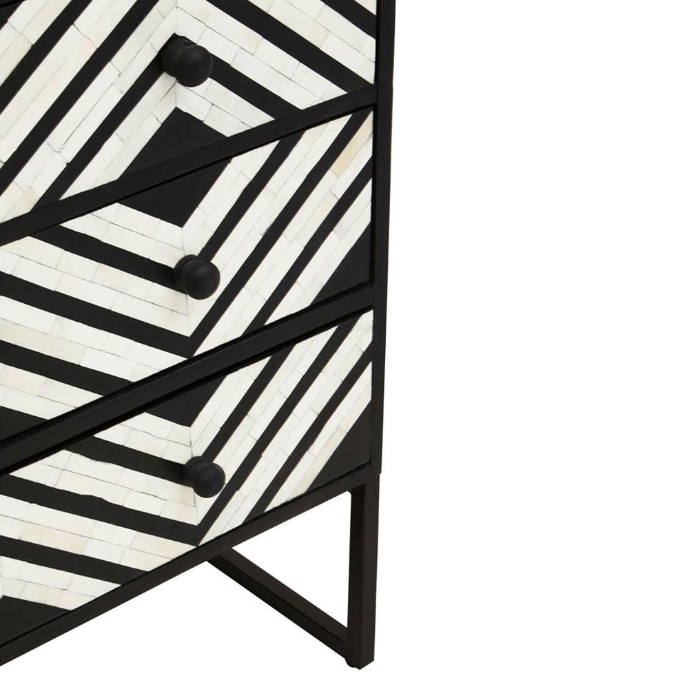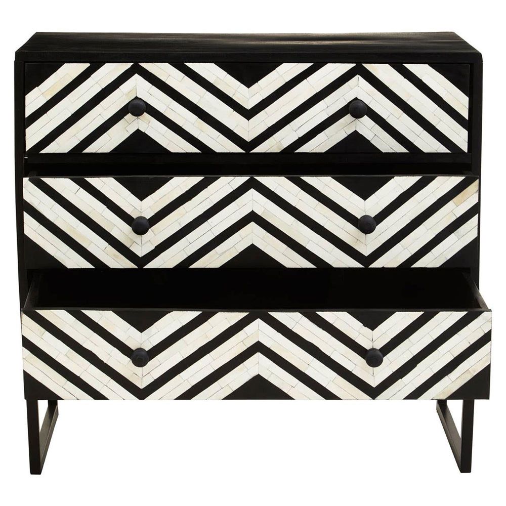 Item Code: 5529038 Skilfully hand carved bone inlay on black wood, this chest with a geometric outer and minimalist profile will style well with boho or transitional decors.This chest is defined by hand laid bone inlay detail, forming a rhombus pattern on solid black wood. Three spacious drawers provide plenty of storage, each adorned with a knob grip. The black finish sledge base harmonises with the organic wood and contributes to modern minimalism.