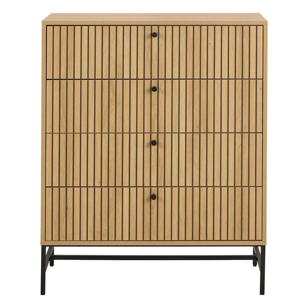 Item Code: H000023619 Albany chest of drawers, top, frame and 4 drawers oak rough melamine, base matt black rough powder coated steel with lamella front. Adorned in an oak look with a lamella front, this chest of drawers knows how to capture attention. Playing with contrast, the oak look complemented by black accents creates a well-balanced visual appeal. With 4 drawers, the chest of drawers offers ample storage, while the easy-care surface enhances its practicality. FSC certified.Free Delivery