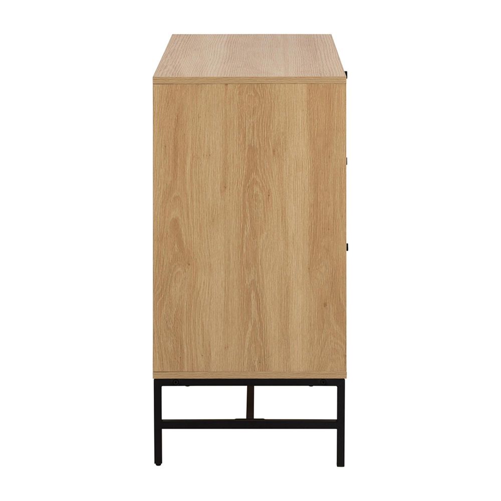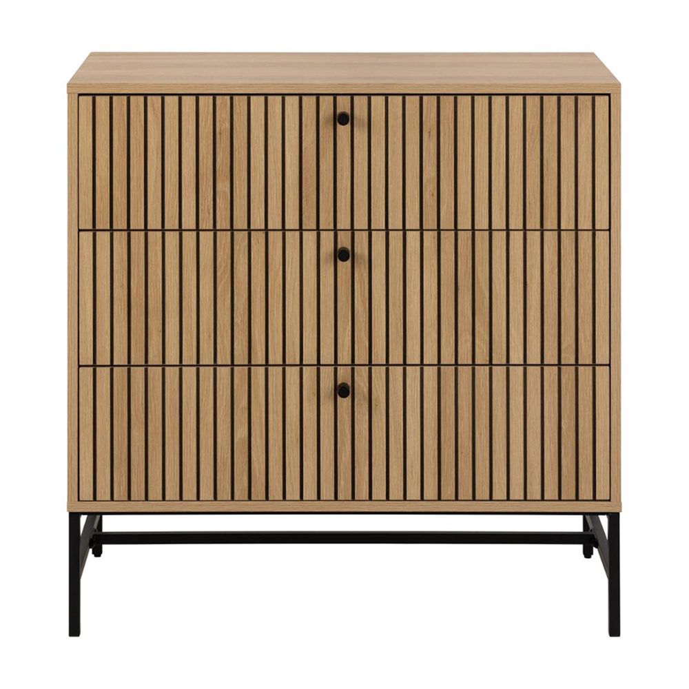 Item Code: H000023618 Albany rectangular chest of drawers, top, frame and 3 drawers oak rough melamine, base matt black rough powder coated steel with lamella front. Adorned in an oak look with a lamella front, this chest of drawers knows how to capture attention. Playing with contrast, the oak look complemented by black accents creates a well-balanced visual appeal. With 3 drawers, the chest of drawers offers ample storage, while the easy-care surface enhances its practicality. FSC certified.Free Delivery