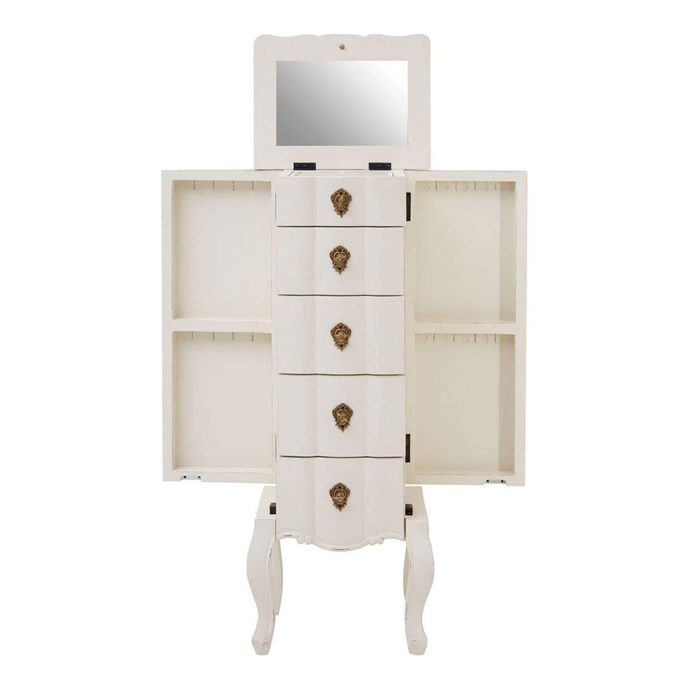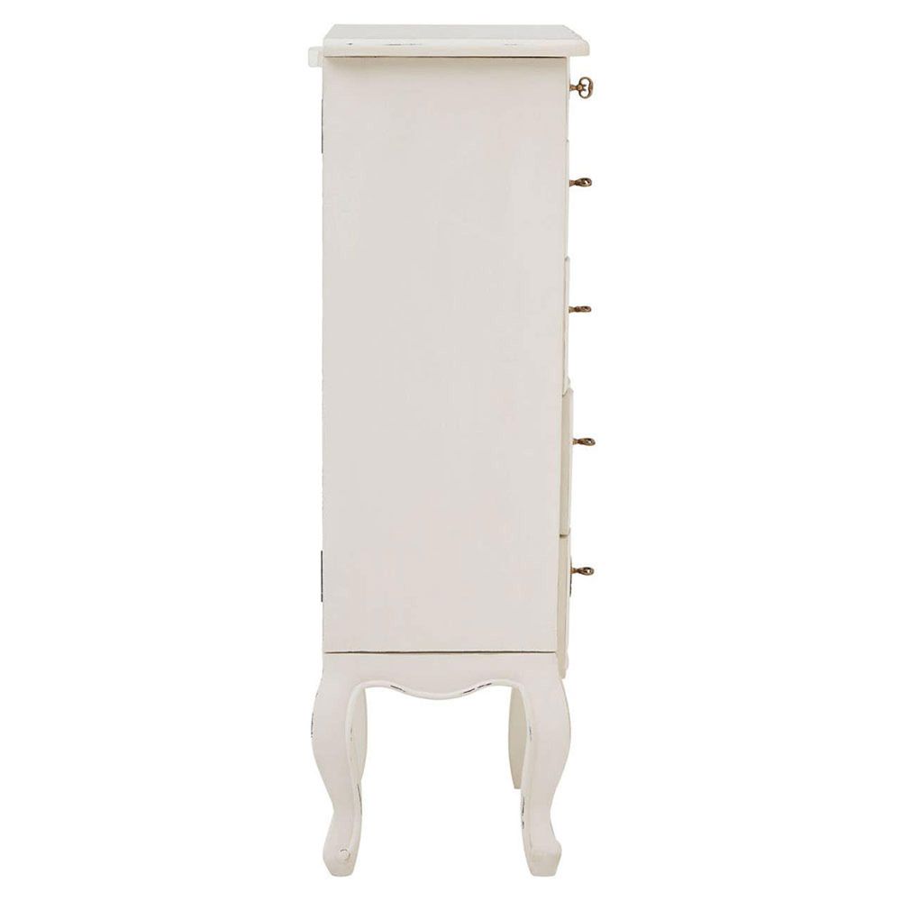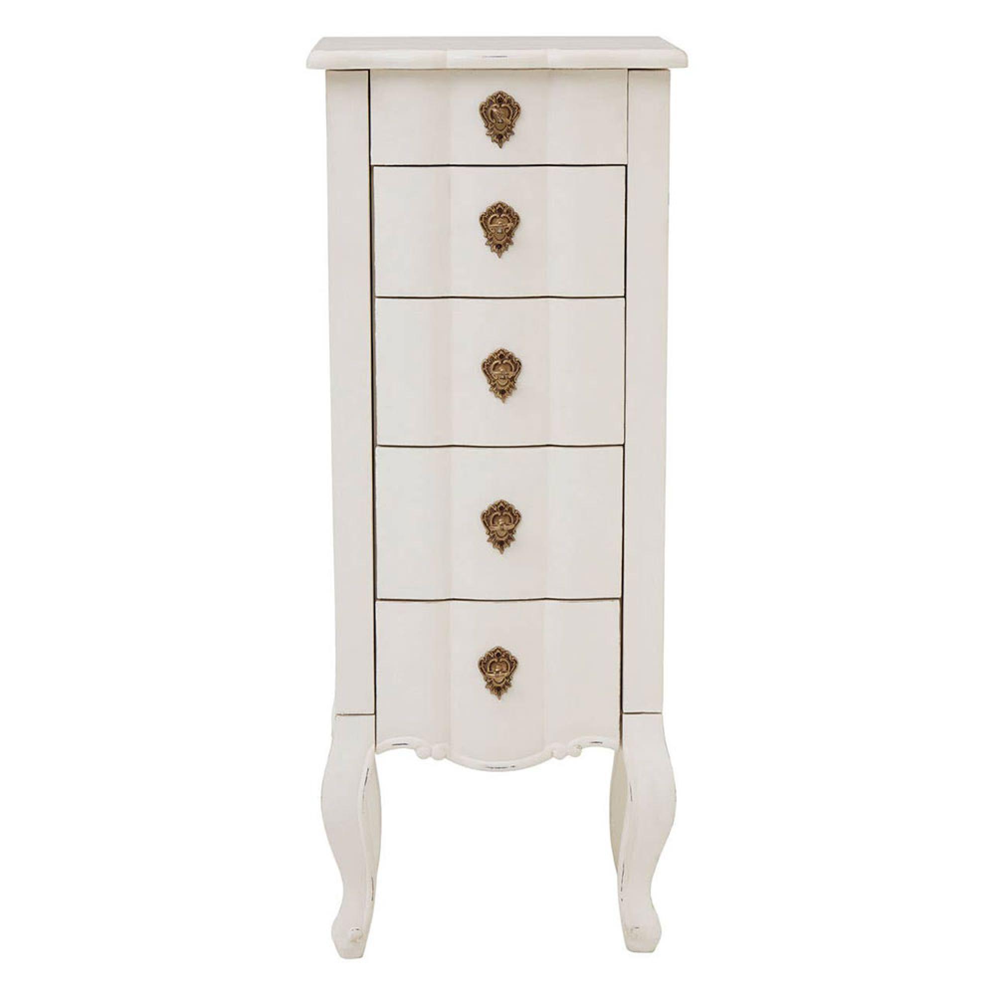 Item Code: 5502130 The Loire chest features five drawers, each one adorned with a baroque-style handle.These handles complement the chest's carved detail, from the curving feet to the undulating base. It's made from natural bayur wood, slightly coarse in texture for a tactile finish. The white colour features distressing to give it an antique look.