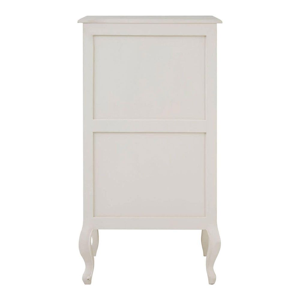 Item Code: 5502131 The Loire chest features five drawers, each one adorned with a baroque-style handle.These handles complement the chest's carved detail, from the curving feet to the undulating base. It's made from natural bayur wood, slightly coarse in texture for a tactile finish. The white colour features distressing to give it an antique look.