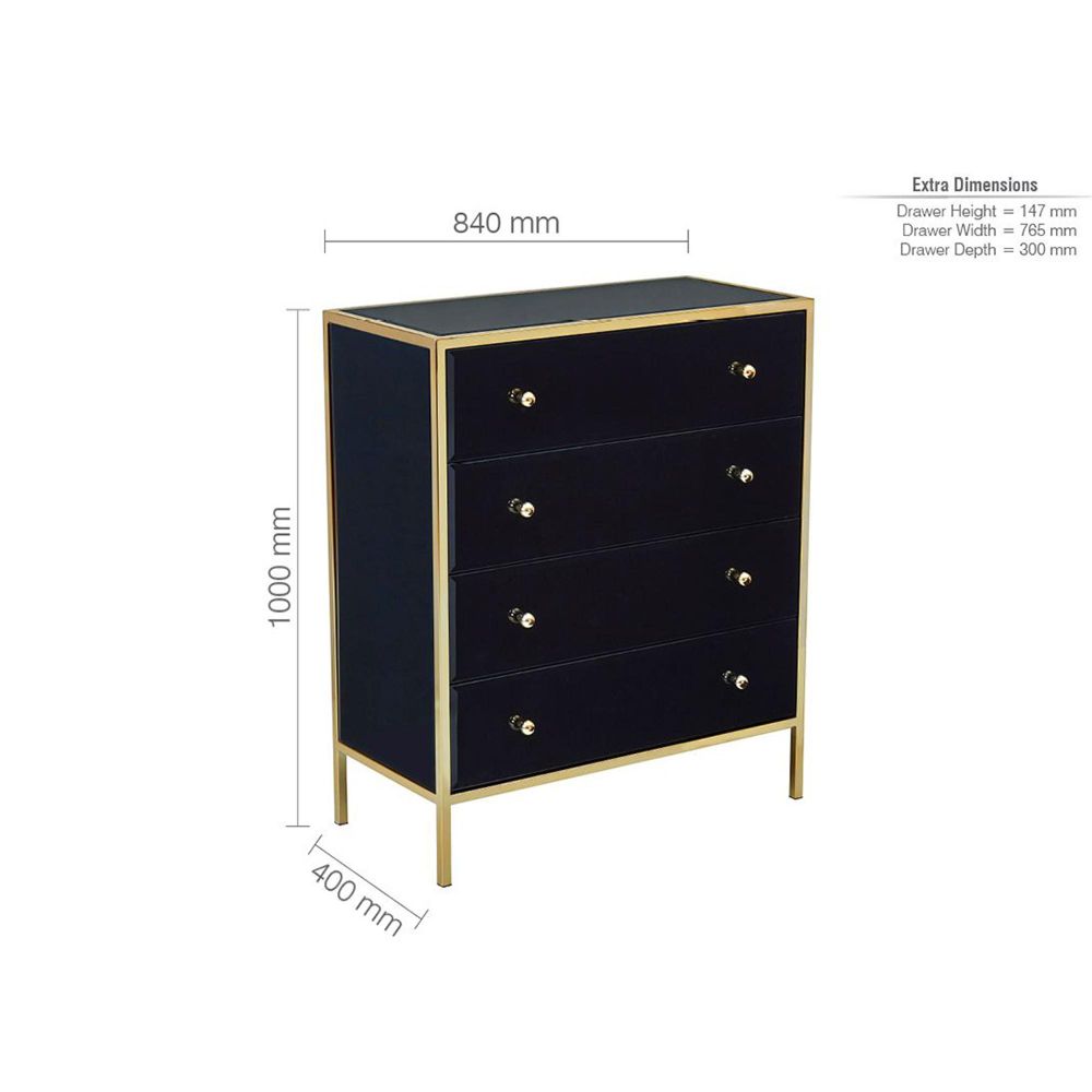 Item Code: FENCH4MIR Fenwick range exudes glamour, charm and luxury. At home in any classic room, this stunning design demands attention thanks to its bevelled glass black panels and stunning gold frame.The Fenwick 4 drawer chest features 4 spacious drawers providing plenty of storage space.This range is certainly eye catching and guaranteed to be suitable for most stores, showroom and online stores.Cleaning and Care: Wipe with dry cloth.