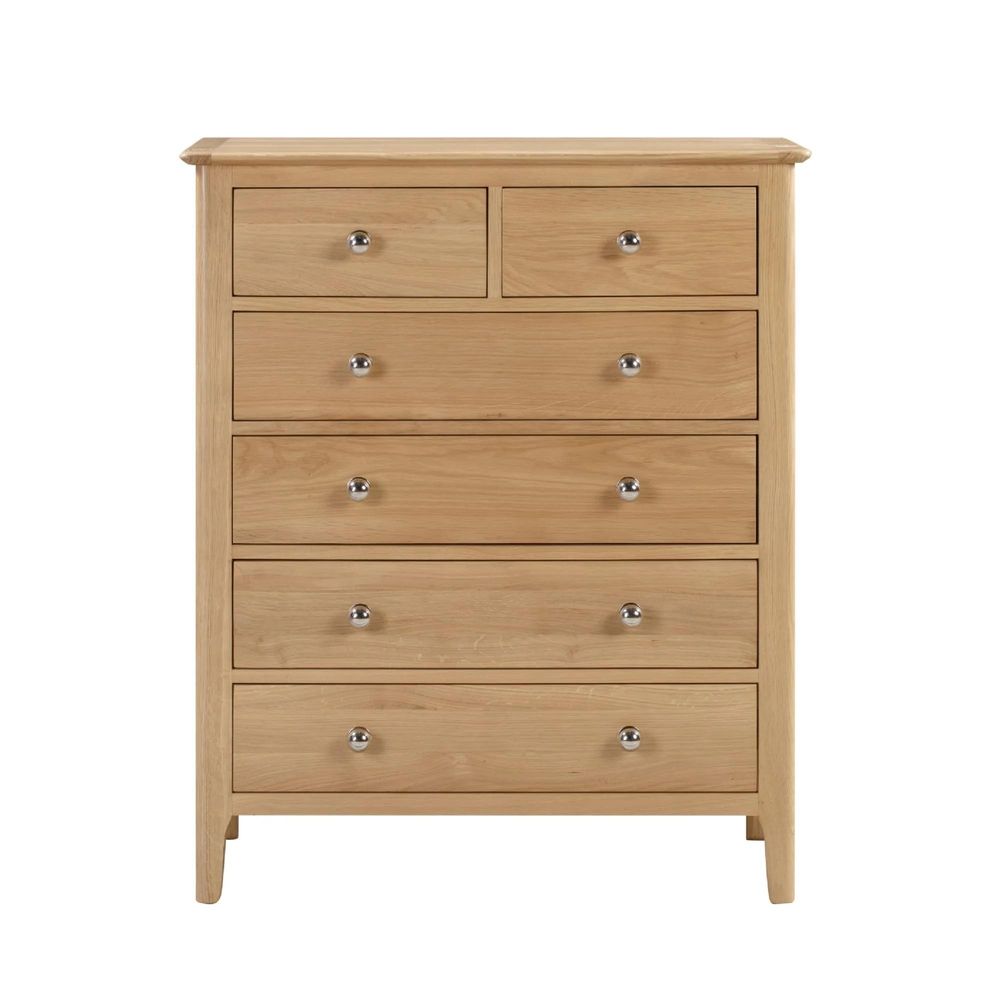 Item Code: COT102 Crafted from solid oak and oak veneers, the Cotswold 4+2 Drawer Chest ensures lasting durability with its robust structure. Featuring two small drawers and four larger drawers, providing ample space for keeping your clothing organised. This simple, yet elegant design is finished with a round silver knob, perfect for any traditional bedroom.