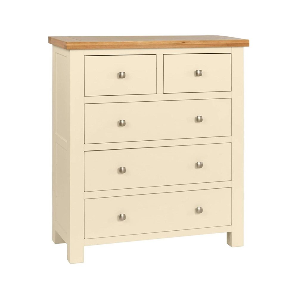 Its clean ivory tones bring a sense of lightness to your room, while the natural wood top finished in a light wax highlights the unique grain of the oak. Designed with practicality in mind, this chest provides two smaller drawers for everyday essentials and three full-width drawers for larger storage needs, all with smooth dovetail joints for lasting strength.