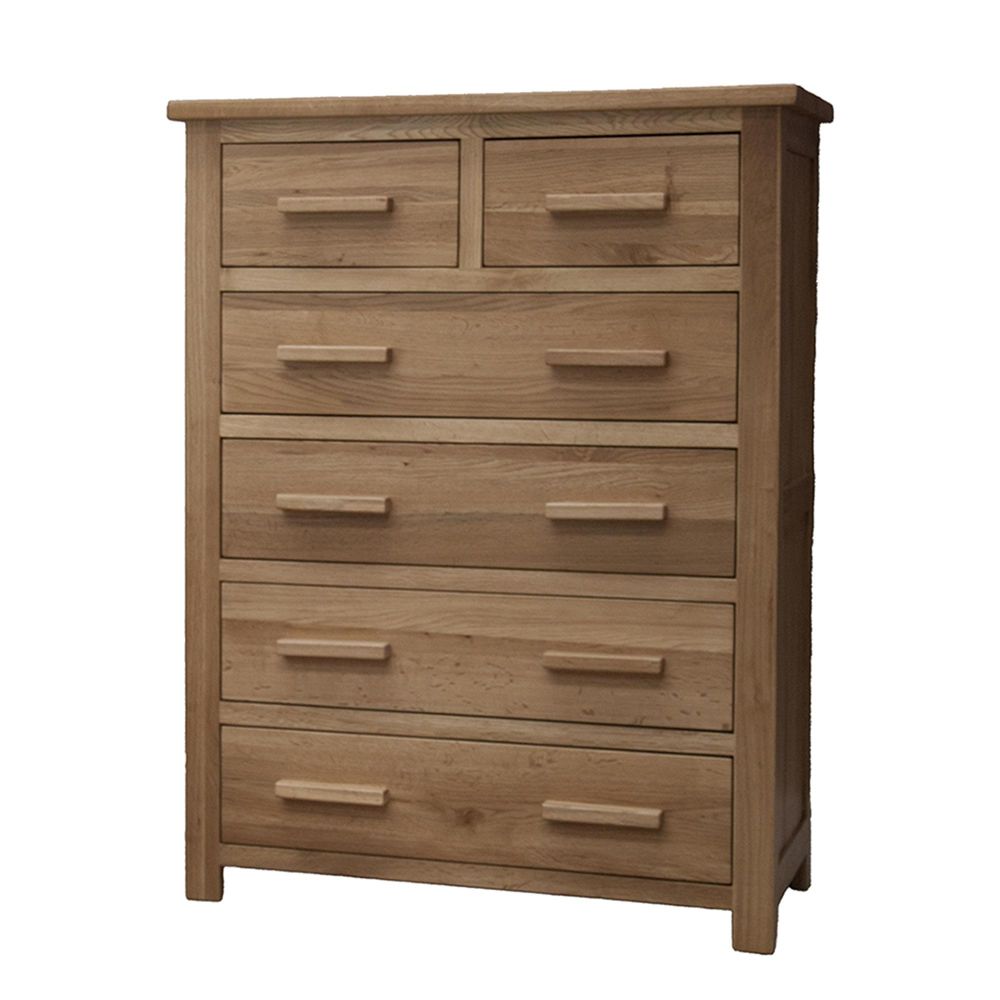 The Opus Oak 4+2 Drawer Chest is expertly crafted from 100% solid oak, offering a generous and practical storage solution for any bedroom. Its classic design combines four large lower drawers with two smaller upper drawers, providing versatile space for clothes, linens, and personal items.