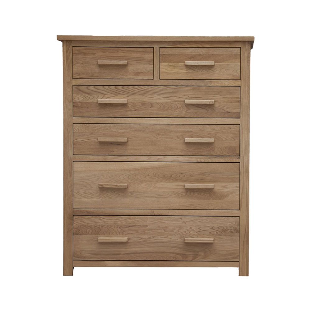 The Opus Oak 4+2 Drawer Jumbo Chest is expertly crafted from 100% solid oak, designed to offer generous storage while maintaining a classic, elegant look. With four large drawers and two smaller drawers above, this chest provides ample space to keep clothes, linens, and personal items neatly organised.