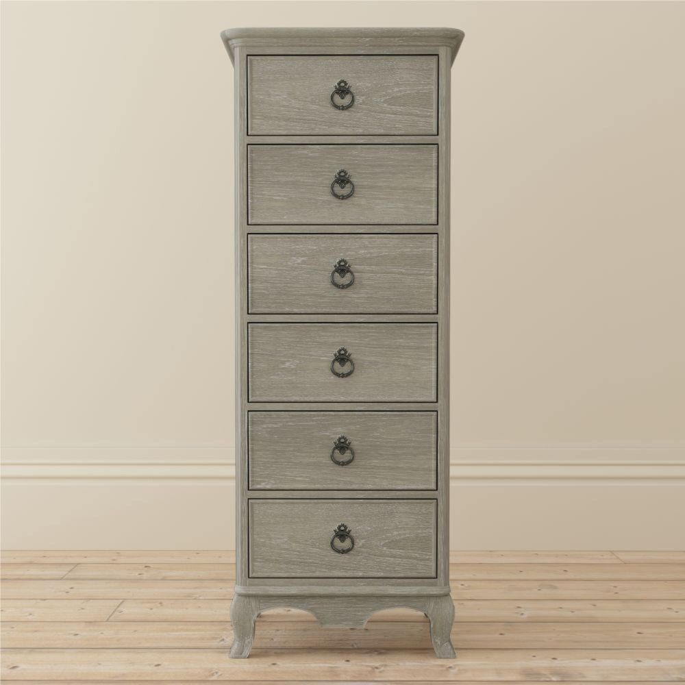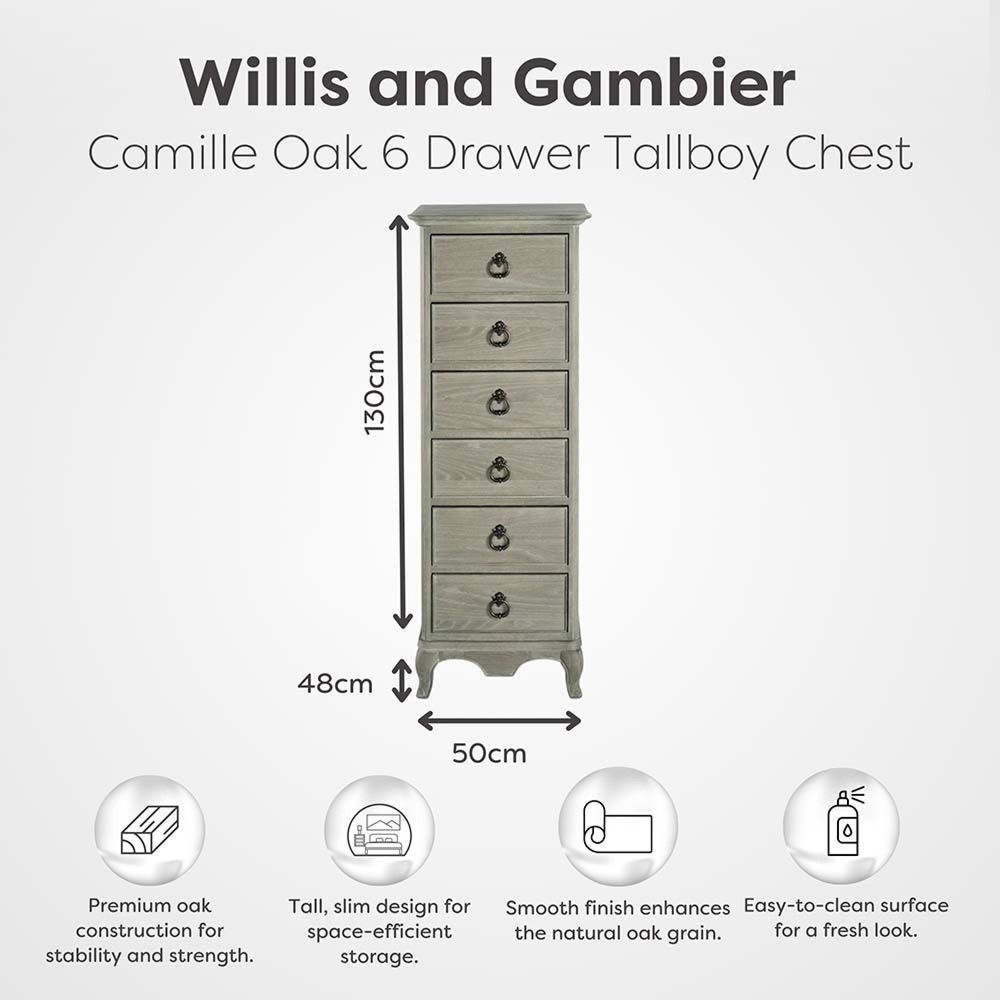 The Willis & Gambier Camille Grey Oak 6 Drawer Tall Chest combines style, craftsmanship, and practicality in one elegant piece.