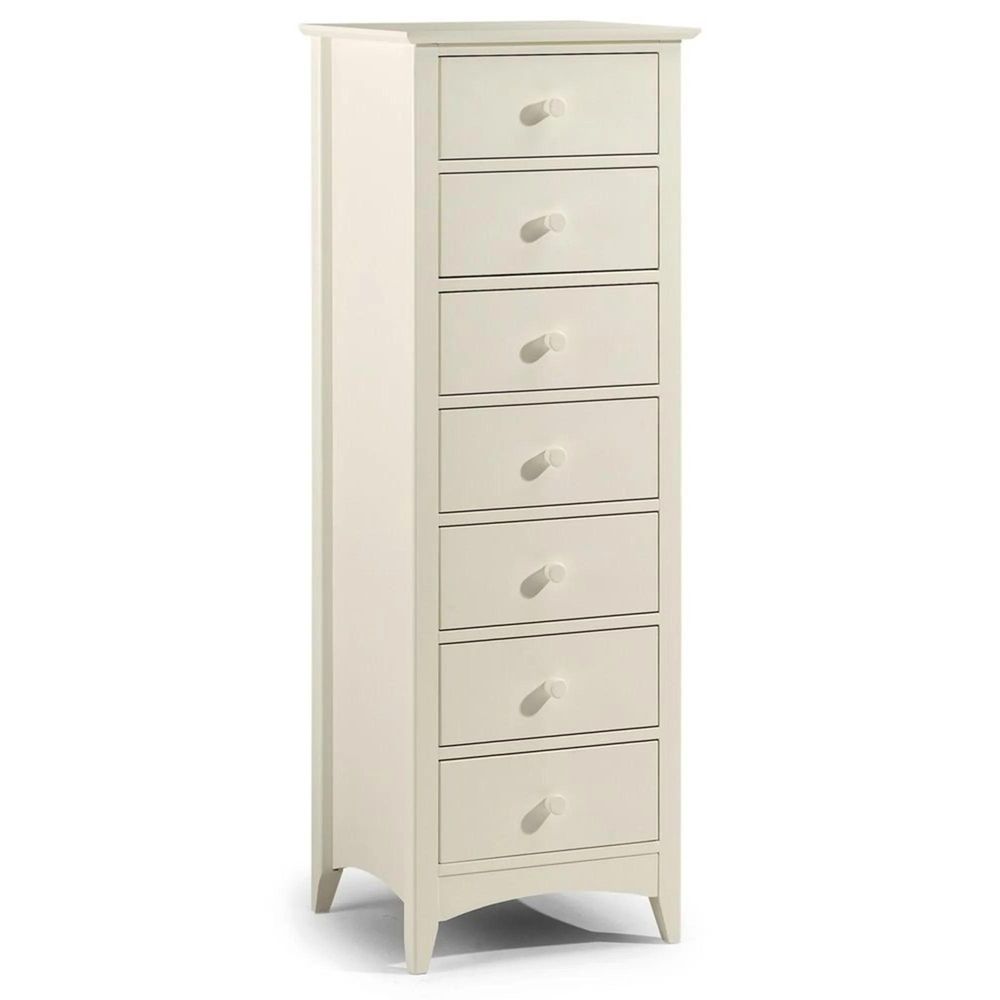 Item Code: CAM004/2 Cameo is a beautiful stone white lacquered bedroom range. Its timeless shaker design is the perfect accompaniment to any interior style and is perfect for grown-up bedrooms and children's bedrooms alike. Solid pine frames ensure a sturdy and durable construction. The Cameo 7 drawer chest offers a great storage solution for smaller rooms given its compact footprint.