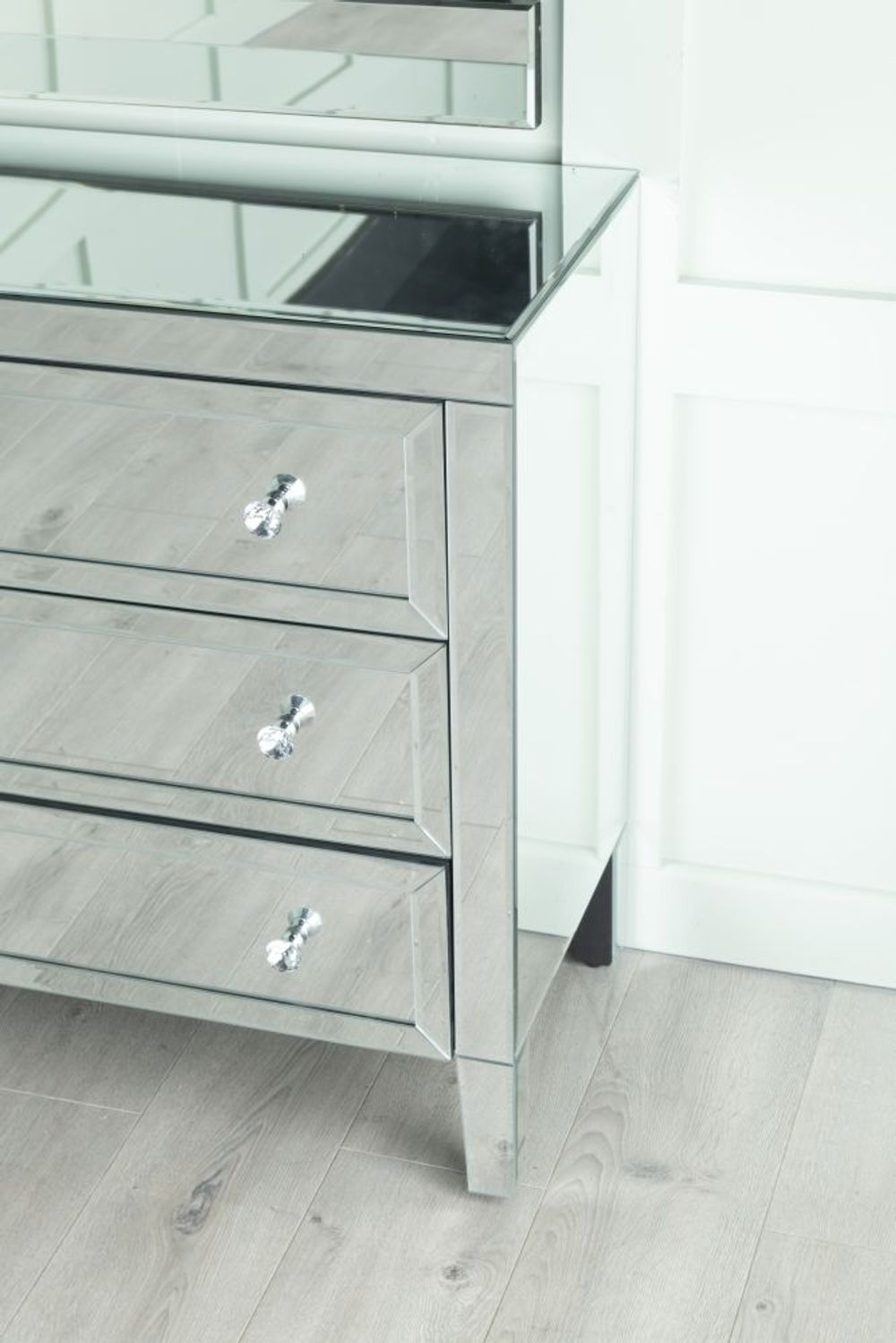 The Lucia Mirrored 3 Drawer Small Chest is a refined piece of bedroom furniture designed for those who value both style and practicality. Its sleek mirrored finish, paired with elegant bevelled edges, creates a reflective surface that captures light beautifully—adding a sense of brightness and sophistication to any bedroom.