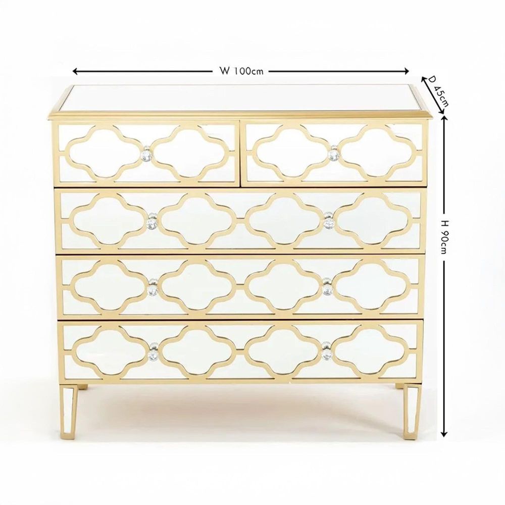 Bring timeless sophistication into your home with the Casablanca Mirrored Gold Trim 3+2 Drawer Chest. Designed with a striking mirror finish and complemented by an ornate gold trim, this piece captures both elegance and practicality. Its reflective surfaces brighten any space while the intricate detailing adds a touch of classic refinement.