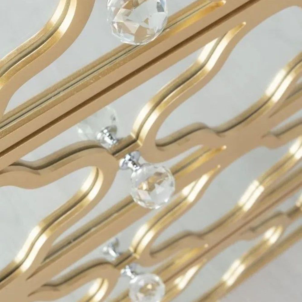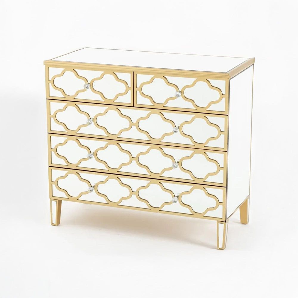 The chest features three spacious drawers for everyday storage, alongside two smaller drawers, ideal for accessories or delicate items. Each drawer is finished with crystal knobs, offering a refined sparkle and easy handling. With its generous surface top, this chest is as functional as it is decorative, serving as a statement piece in bedrooms, living areas, or dressing spaces.