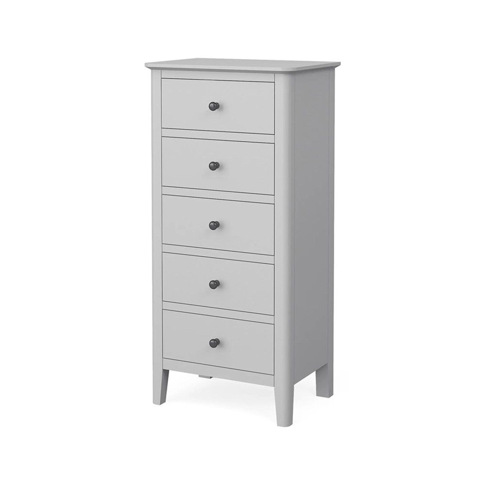 Add refined storage to your bedroom with the Stowe Grey 5 Drawer Narrow Chest. Inspired by Scandi design, this piece combines clean lines, gentle curves, and elegant tapered legs for a timeless, sophisticated look. Its slim profile makes it an excellent choice for smaller spaces, while still providing generous storage across five drawers.