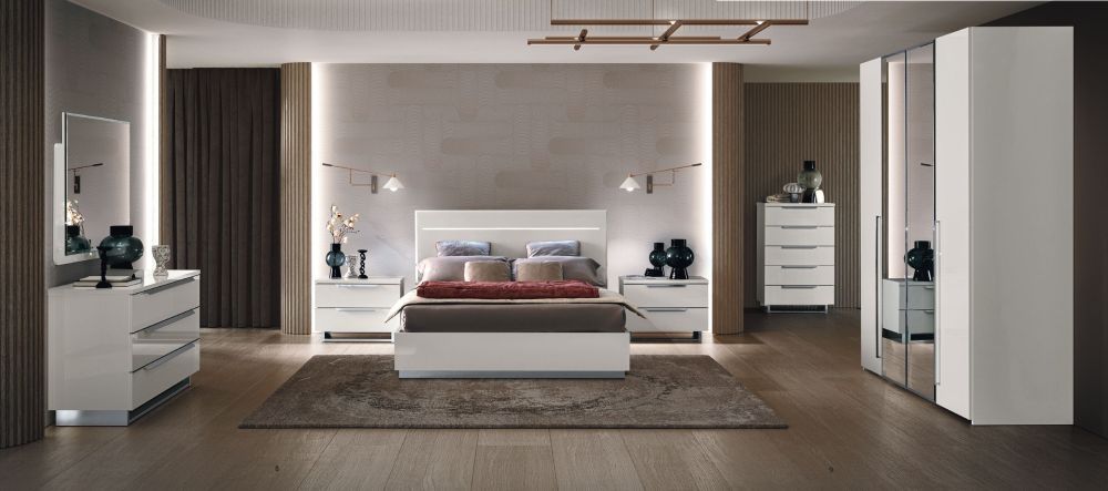 Item Code: 174CMS.01BI The luminous white glossy finish is coupled togheter with trapezium shaped brushed alluminium handles. Swithces for the LED diffuesd light (4000 K)located on both sides of the headboard. Beds with anti dust platform. Safe and easy to use storage space solution available. Night tables, tallboy and dressers tops 30mm thick whilst the inside of the drawer is covered with antiscratch material. All drawers run on soft closing guides.This is a Made to Order itemAll Made to Order items are manufactured as per the order supplied by you.We are unable to accept cancellation or accept any extra cost that may incur due to wrong information provided by you at the time you placed the order.We will confirm all sizes/colours/finishes in written email (order confirmation) with you before going ahead with production of your order.