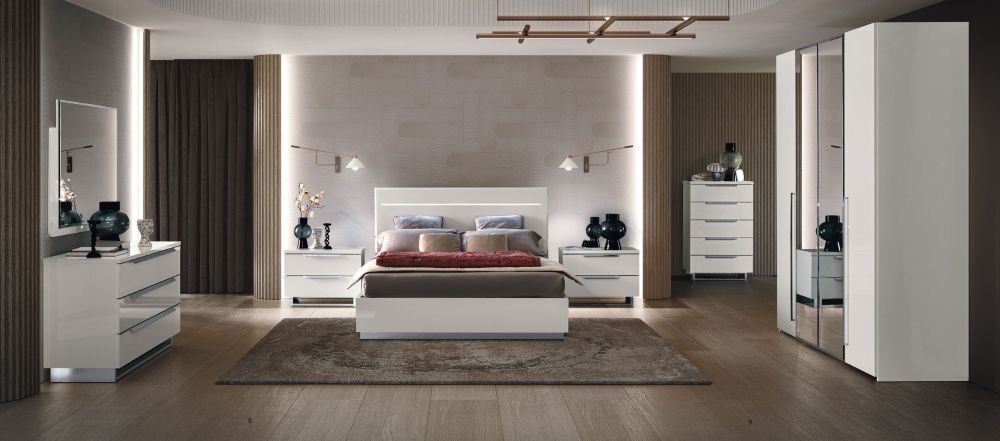 Item Code: 174SET.01BI The luminous white glossy finish is coupled togheter with trapezium shaped brushed alluminium handles. Swithces for the LED diffuesd light (4000 K)located on both sides of the headboard. Beds with anti dust platform. Safe and easy to use storage space solution available. Night tables, tallboy and dressers tops 30mm thick whilst the inside of the drawer is covered with antiscratch material. All drawers run on soft closing guides.This is a Made to Order itemAll Made to Order items are manufactured as per the order supplied by you.We are unable to accept cancellation or accept any extra cost that may incur due to wrong information provided by you at the time you placed the order.We will confirm all sizes/colours/finishes in written email (order confirmation) with you before going ahead with production of your order.